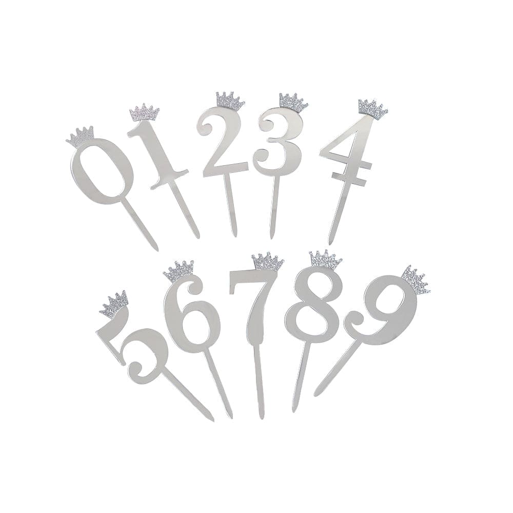The set included 10pcs acrylic numbers (0-9) cake topper, each number is topped with a golden or silver crown, and any number can be assembled at will. 0-9 Numbers cake topper is 4" tall, 7" tall in total.