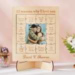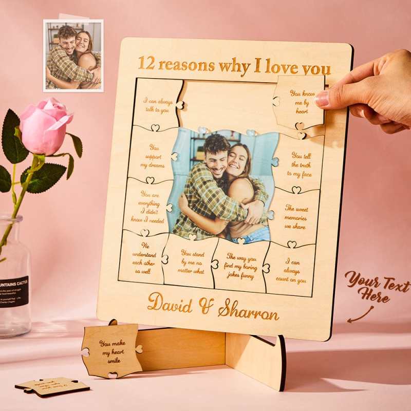 12 reasons why I love you wooden plaque puzzle printed with your photo is one of the best gift choice for Valentine's Day. The middle picture is made of acrylic. It is both a delicate table decor also a fun puzzle. Tell 12 reasons why you love him or her and show your love with this plaque.