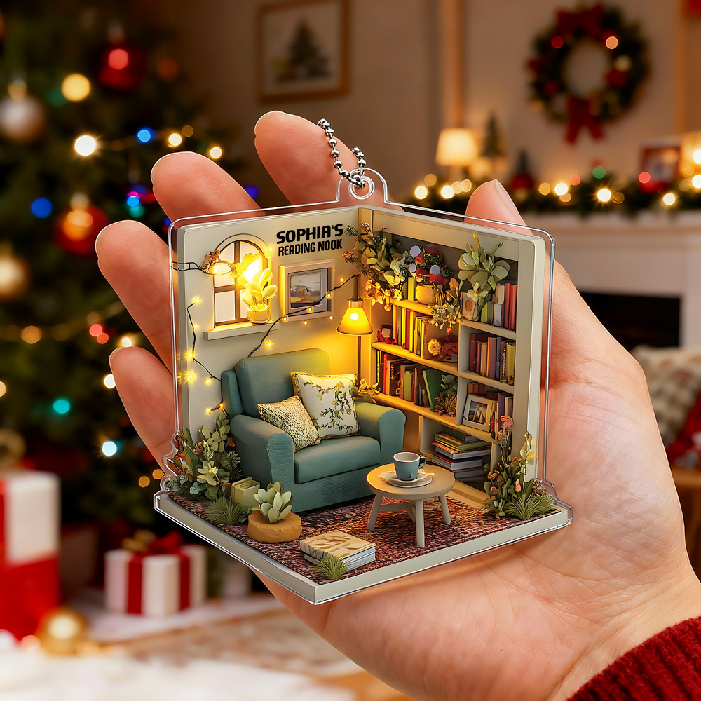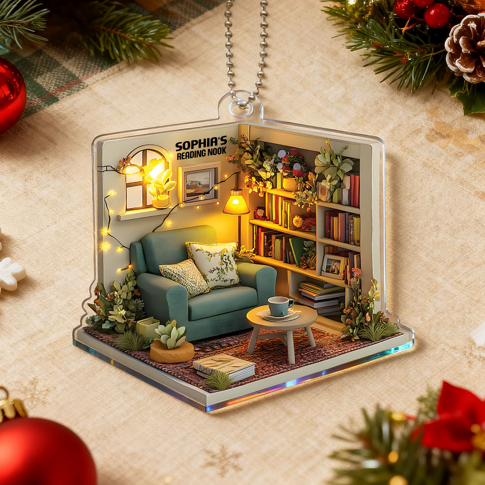 Bring warmth and charm to your holiday décor with the Personalized "Dreamy Cozy Reading Nook" Acrylic Ornament. Featuring a snug armchair, glowing lamp, and shelves filled with colorful books, this unique ornament captures the magic of a peaceful little reading corner. The vibrant 2D flat design brings every detail to life, making it not just a decoration but a meaningful keepsake for book lovers and dreamers alike.