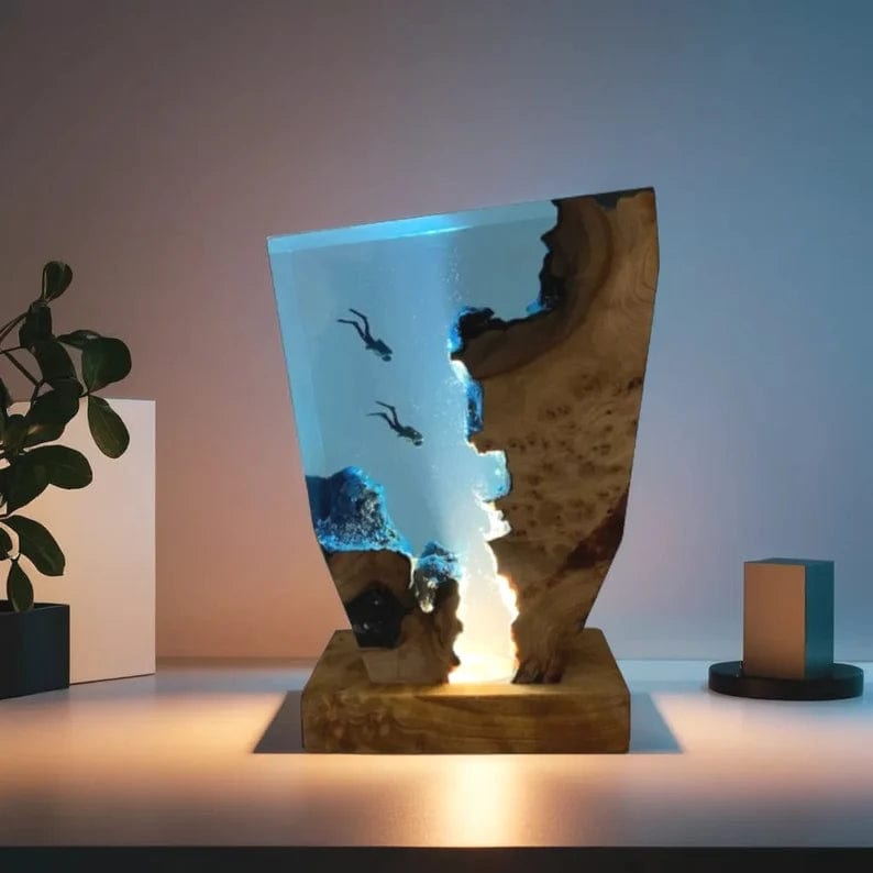 Immerse yourself in the underwater world with our stunning SCUBA DIVER Epoxy Lamp. Handcrafted with wood and resin, this unique night light features 16-color LED lighting and a remote control. Includes:
