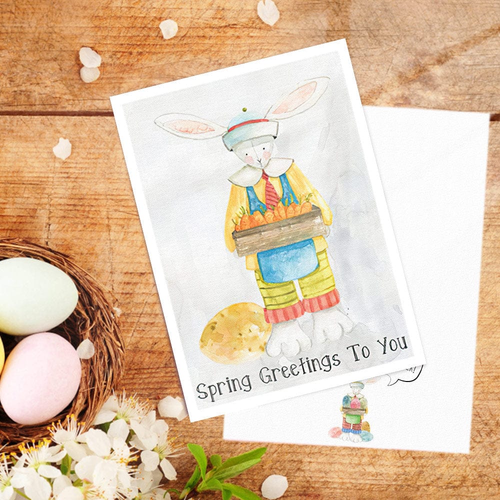 Combining the outer symbolic Easter shape with a Nordic-inspired design creates a gorgeous Easter card to send to the people you care about. The inner design features joyful bunny rabbits leaping amidst spring flowers and plants.