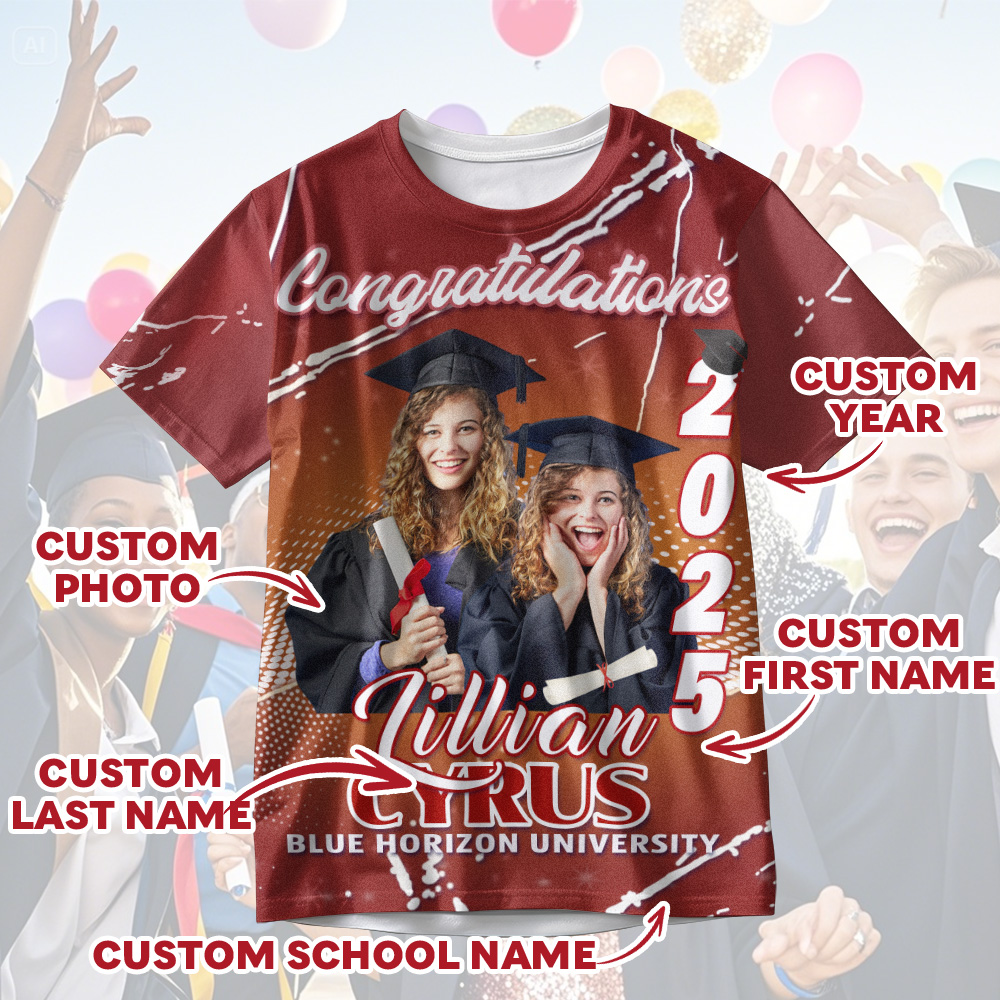 Celebrate their incredible achievement with a truly unique and memorable gift: our Custom 3D Graduation T-Shirt! This isn't just another ordinary graduation tee; it's a personalized keepsake that allows you to create a one-of-a-kind design to commemorate this special milestone.