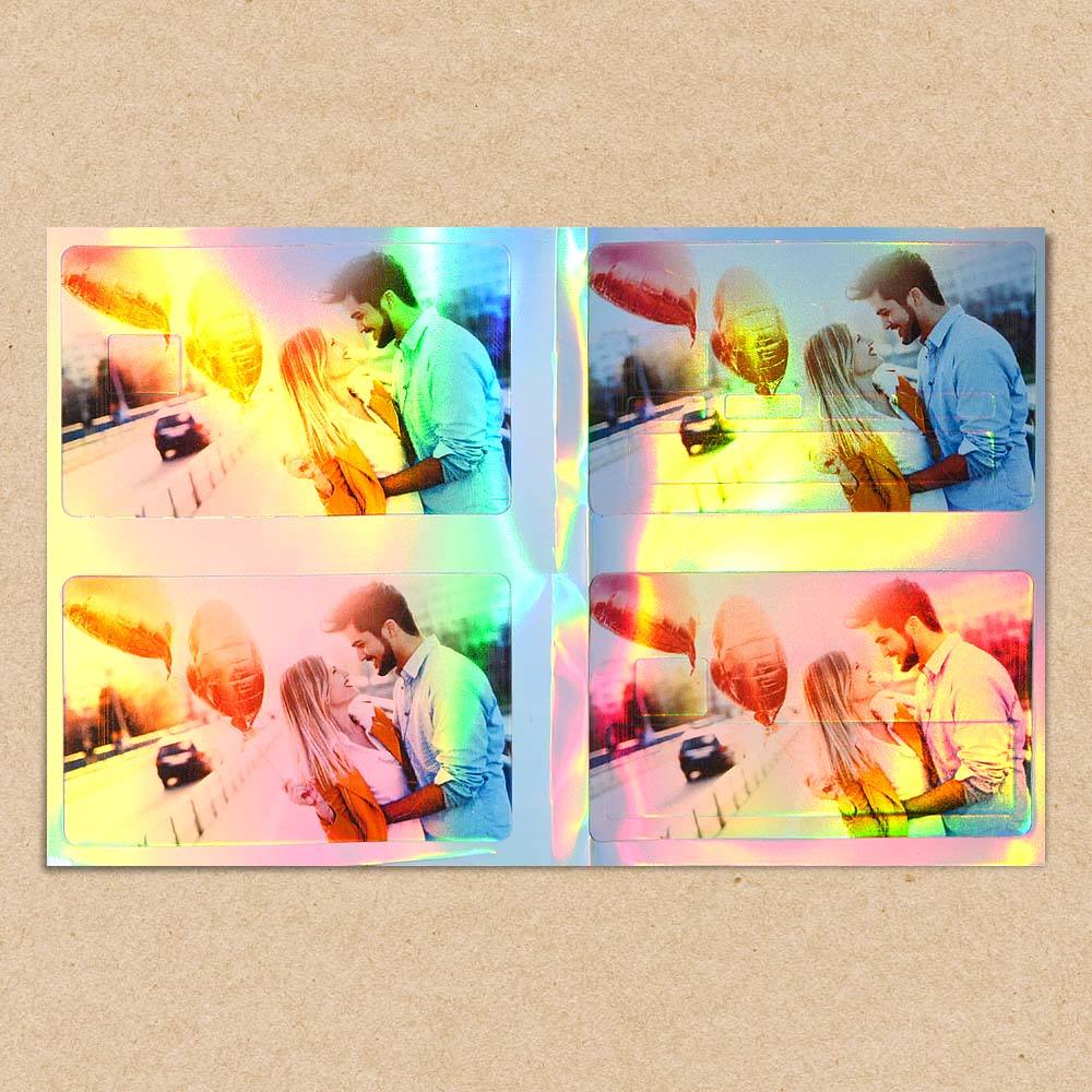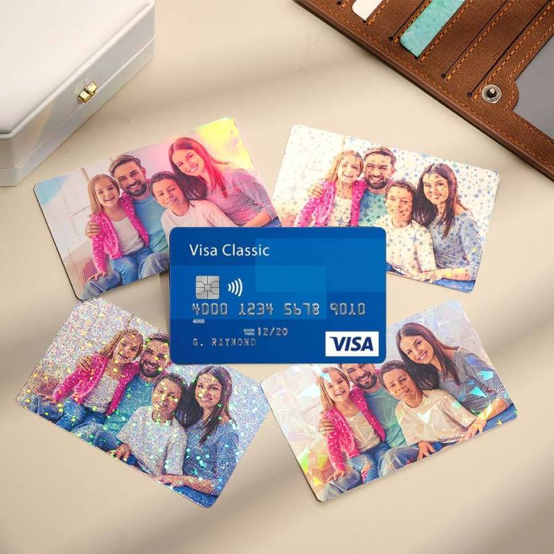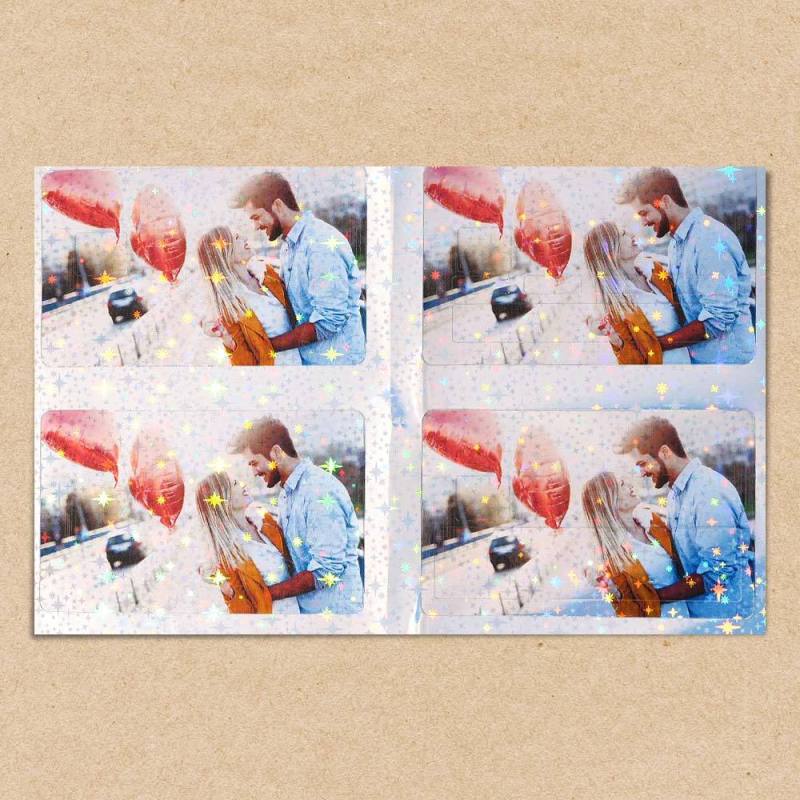 Enhance and protect your cards with this personalized card cover set includes four waterproof, custom photo stickers compatible with both Small and Big Chip cards. Choose from Holo Diamond, Rainbow, Dots, Stars, or Matte finishes without affecting card swiping functionality.