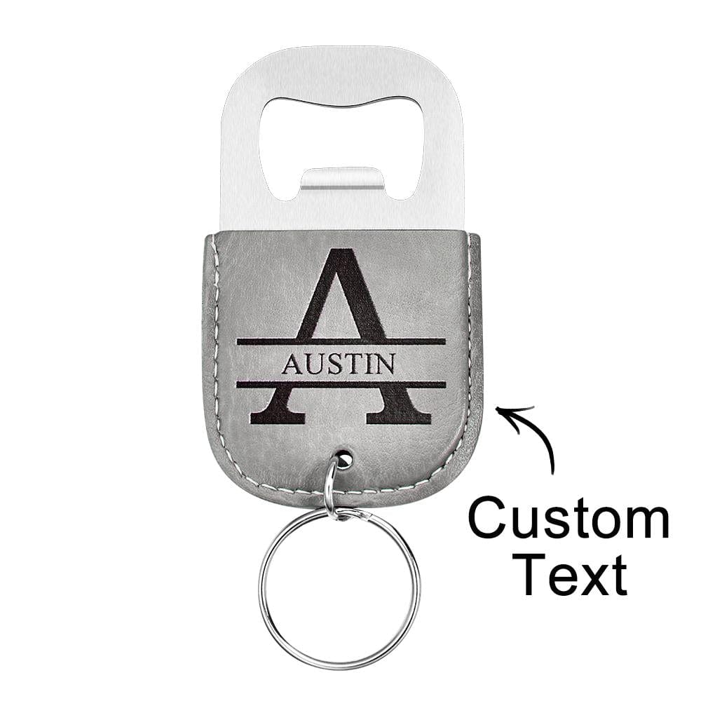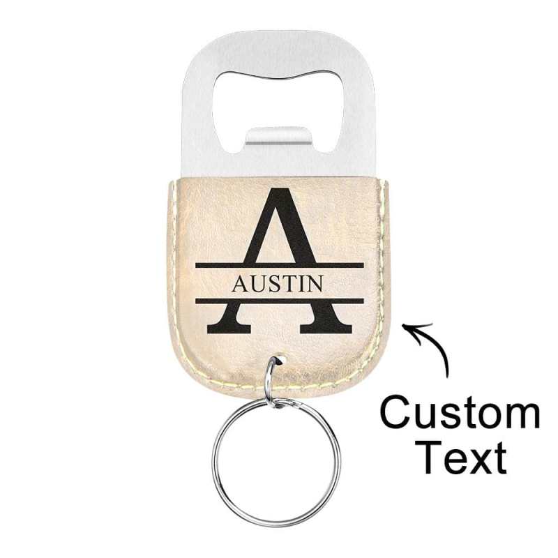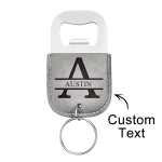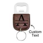 Engraved Leather Keychain with Bottle Opener attached.Perfect for friends, family, and coworkers!Our keychains are engraved with a laser, so no fear of the Personalization fading or rubbing off.
