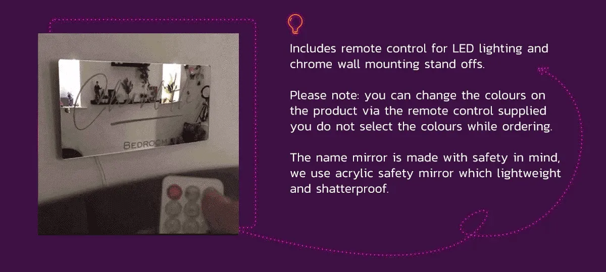 • you can change the colours on the product via the remote control supplied you do not select the colours while ordering.The name mirror is made with safety in mind, we use acrylic safety mirror which lightweight and shatterproof.