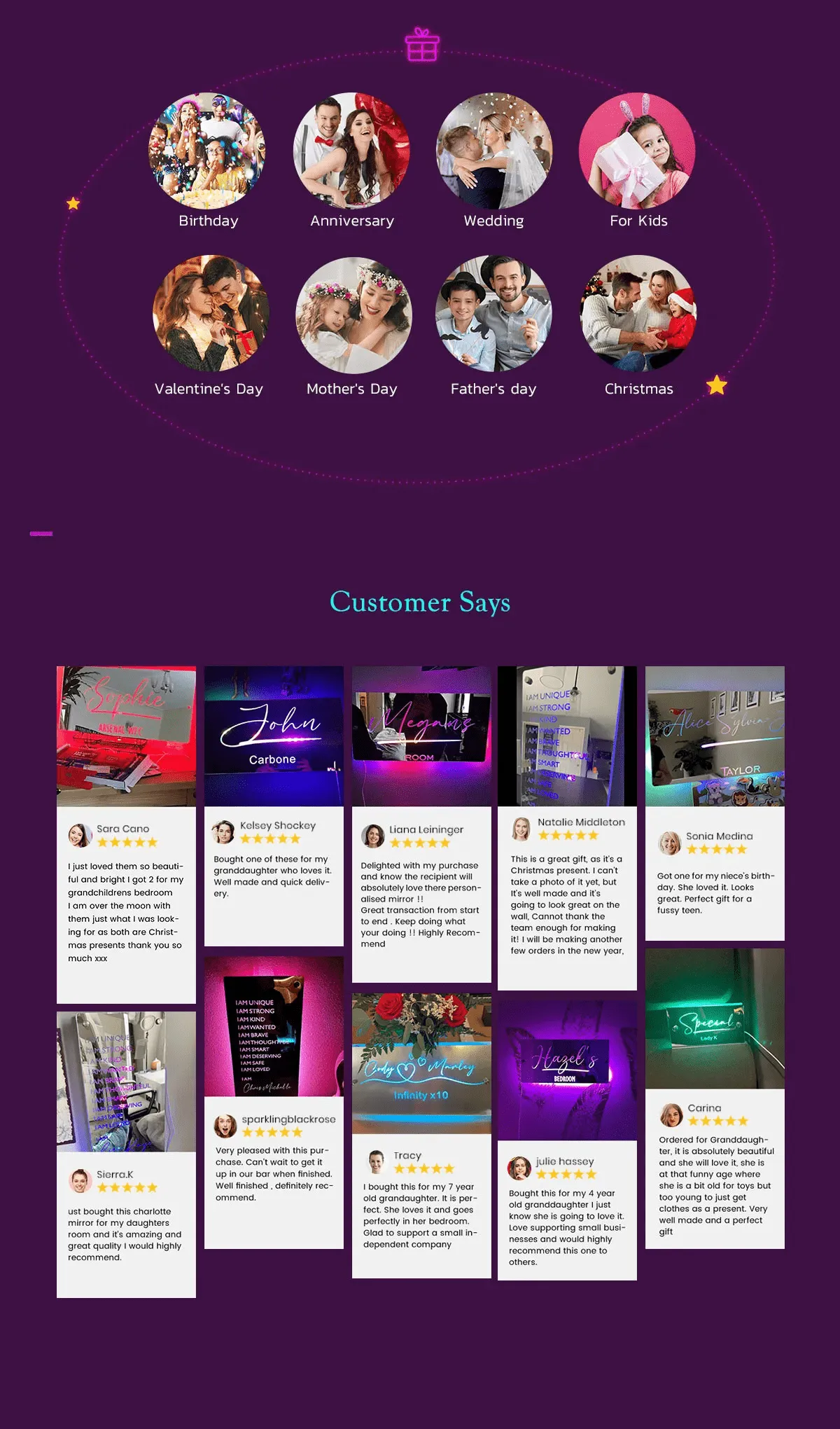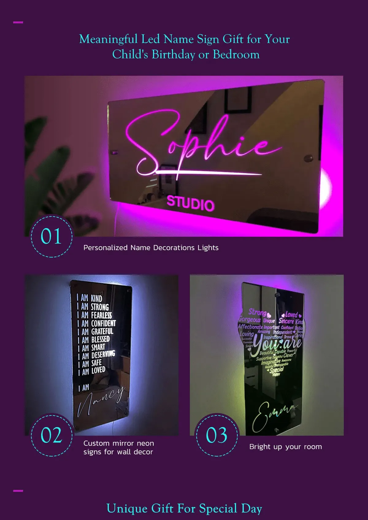 • This super stylish personalised name mirror with LED lighting is a perfect and unique edition to any youngsters bedroom, they will love lighting up the personalised mirror and seeing their own name in lights.This eye-catching personalised name mirror makes the perfect gift for 2024 and it will be cherished and loved for many years to come by the recipient.Includes remote control for LED lighting and chrome wall mounting stand offs.