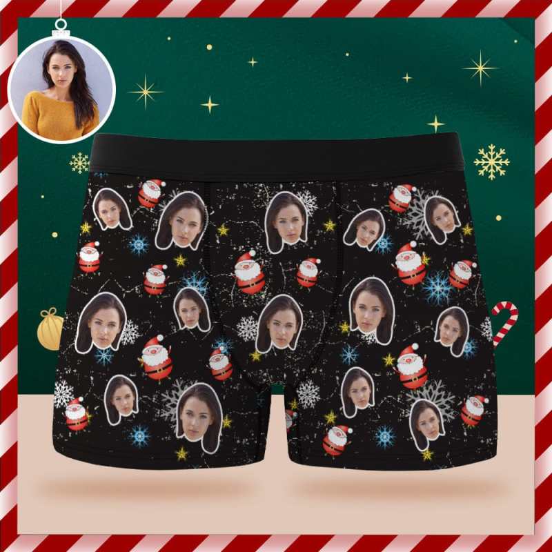 Custom Face Boxer Briefs Santa Claus and Snowflakes Personalized Christmas Gift for Him