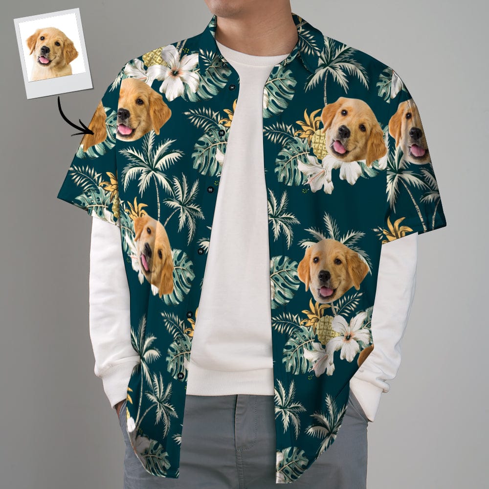 This Hawaiian shirt features print, button-up closure, and short sleeves.