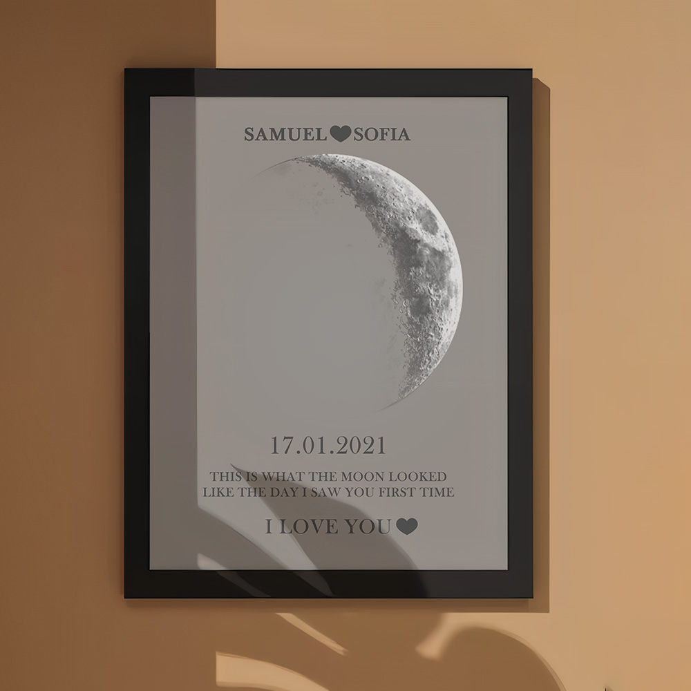 In every extraordinary moment, we use the eternal moon phases to commemorate those heartwarming instances. Celebrate your love with a thoughtful and personalized gift, crafting unique cherished memories for that special night. Our moon night print wooden frame displays the precise lunar phase from the night you first met or the day you were born, making it a truly exceptional and emotionally rich present.