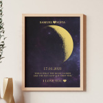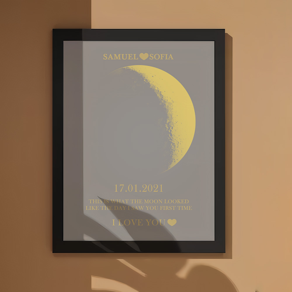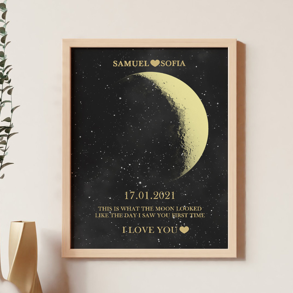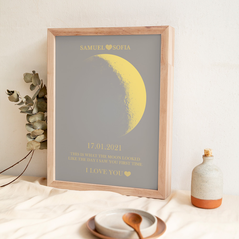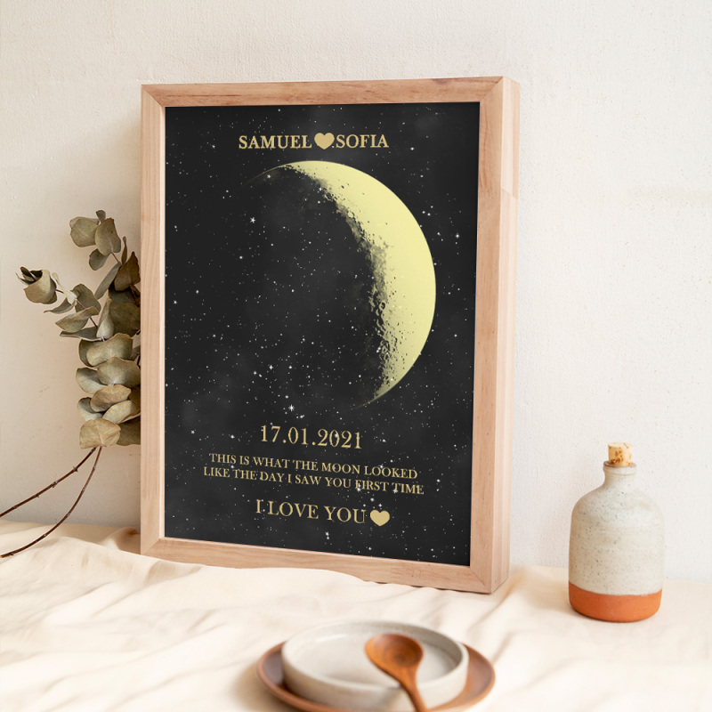 In every extraordinary moment, we use the eternal moon phases to commemorate those heartwarming instances. Celebrate your love with a thoughtful and personalized gift, crafting unique cherished memories for that special night. Our moon night print wooden frame displays the precise lunar phase from the night you first met or the day you were born, making it a truly exceptional and emotionally rich present.