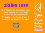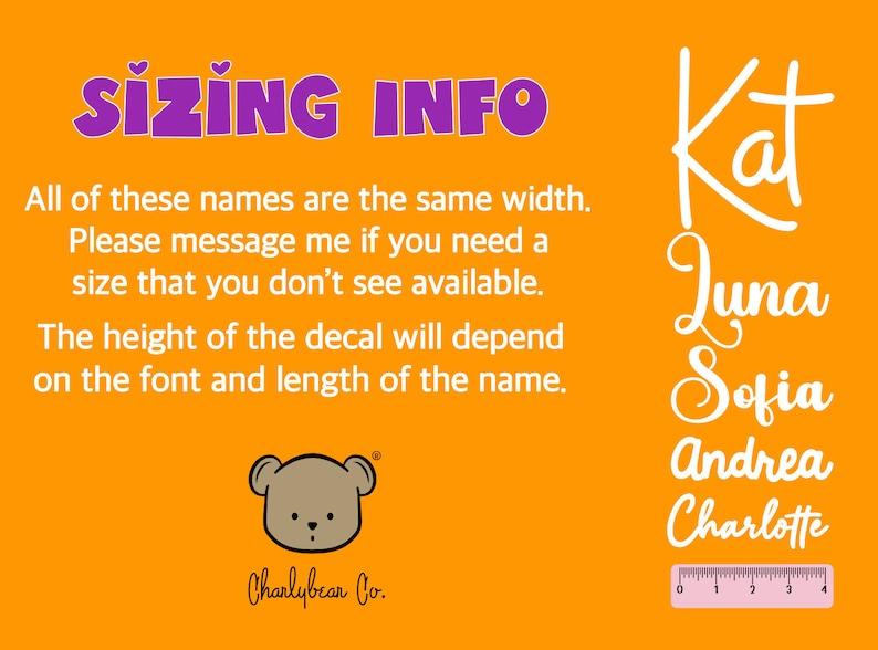 The size choices are in Width, so take into consideration that this will mean the height might vary. The longer the name, the smaller each letter will be. Reach out to me if you're looking for a specific size and I can help you! 💕