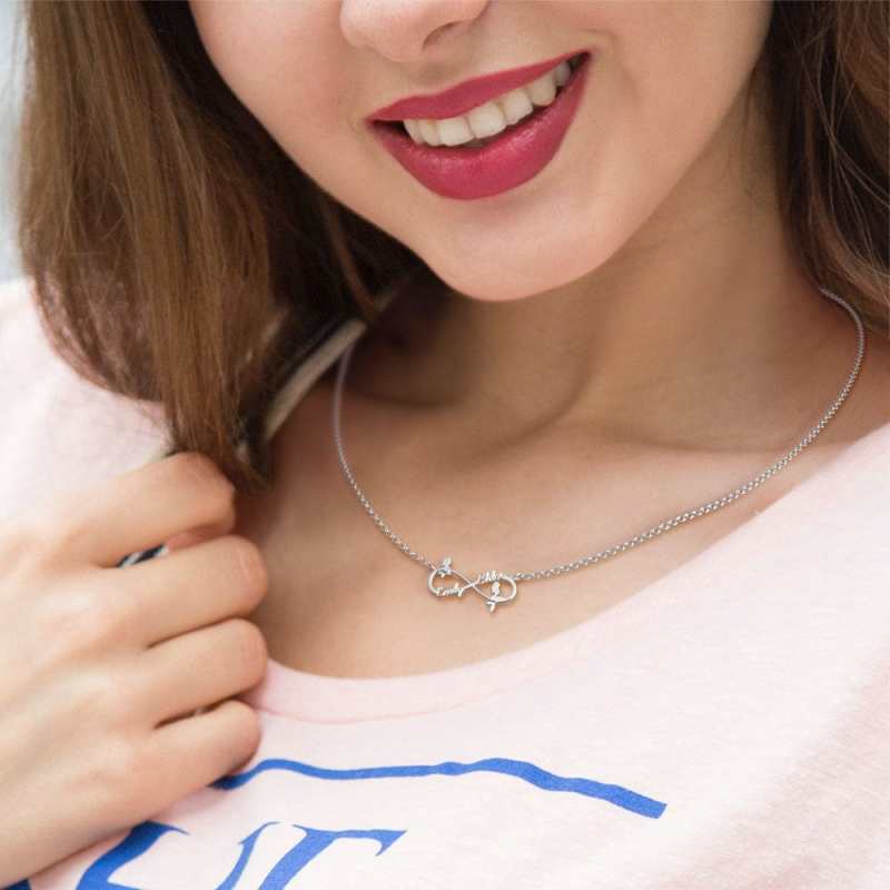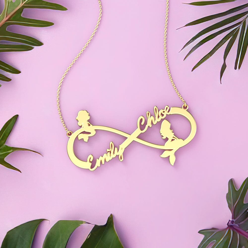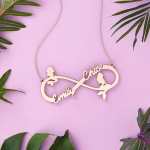 Depending on which style you get, you can customize Name Necklace Official pieces with initials, one name, or two names. There are personalized infinity necklaces, retro nameplate necklaces, and modern bar necklaces.
