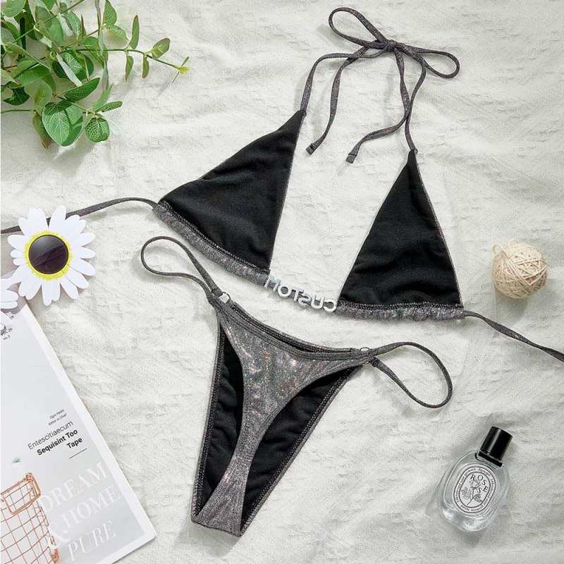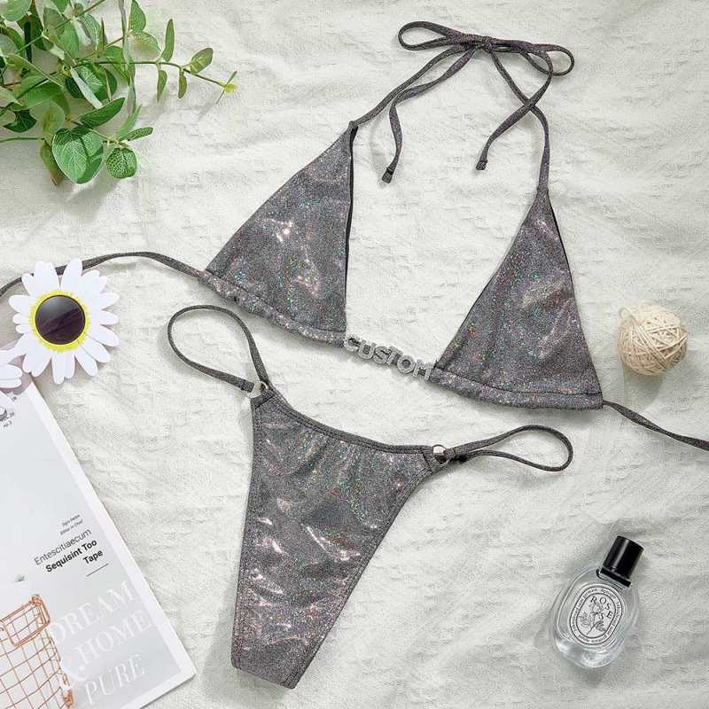 Custom Name Silver Triangle Bikini Sets Sexy DIY Crystal Letters Bikini
