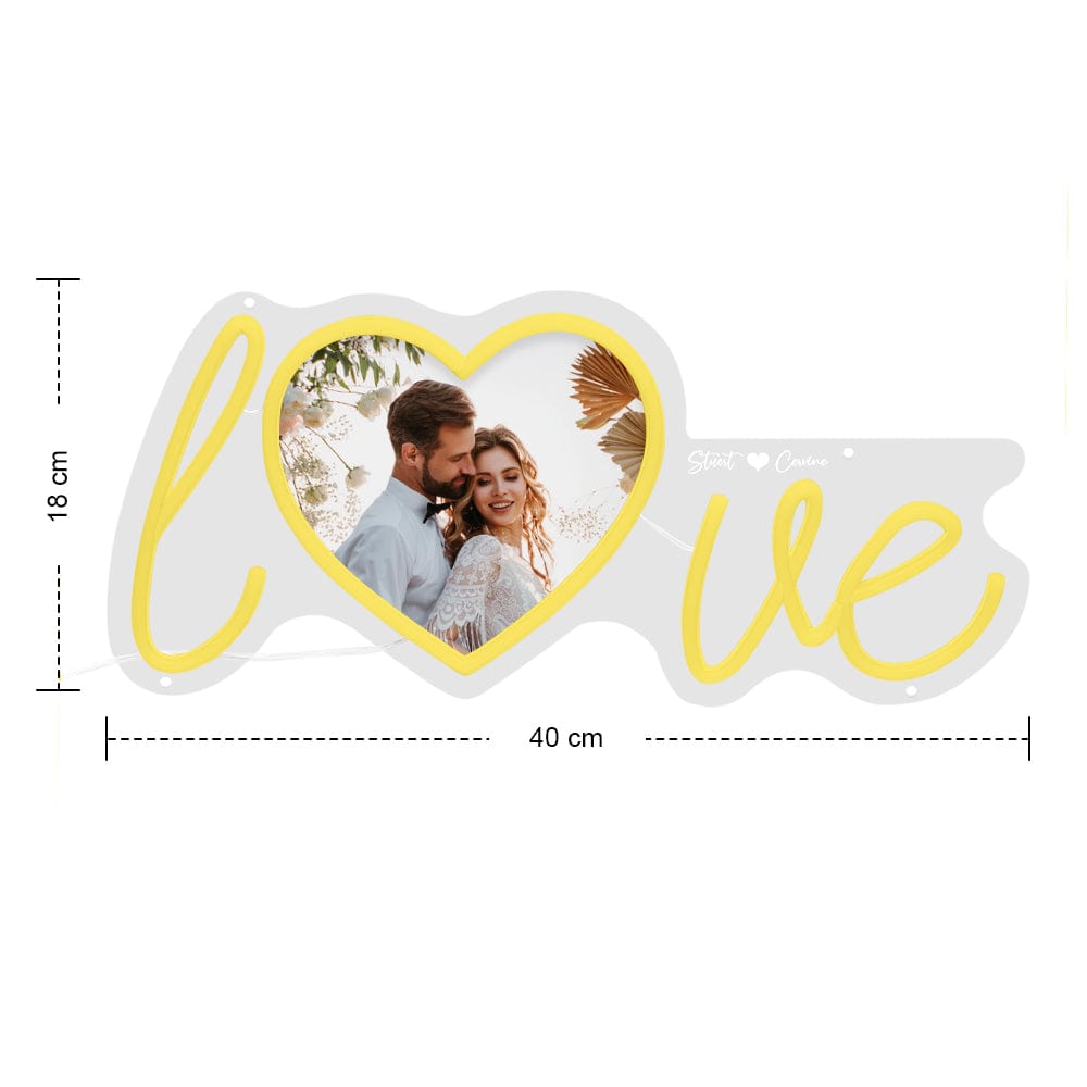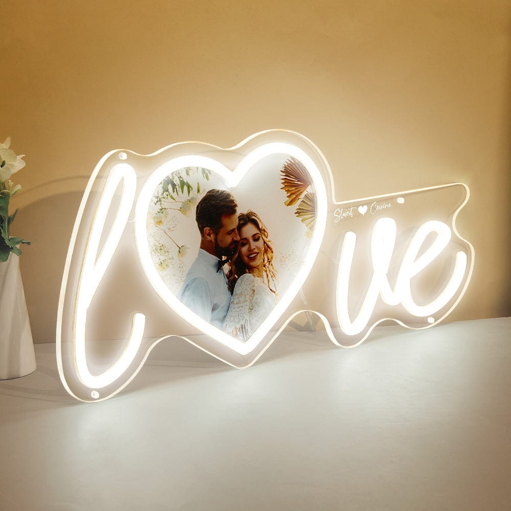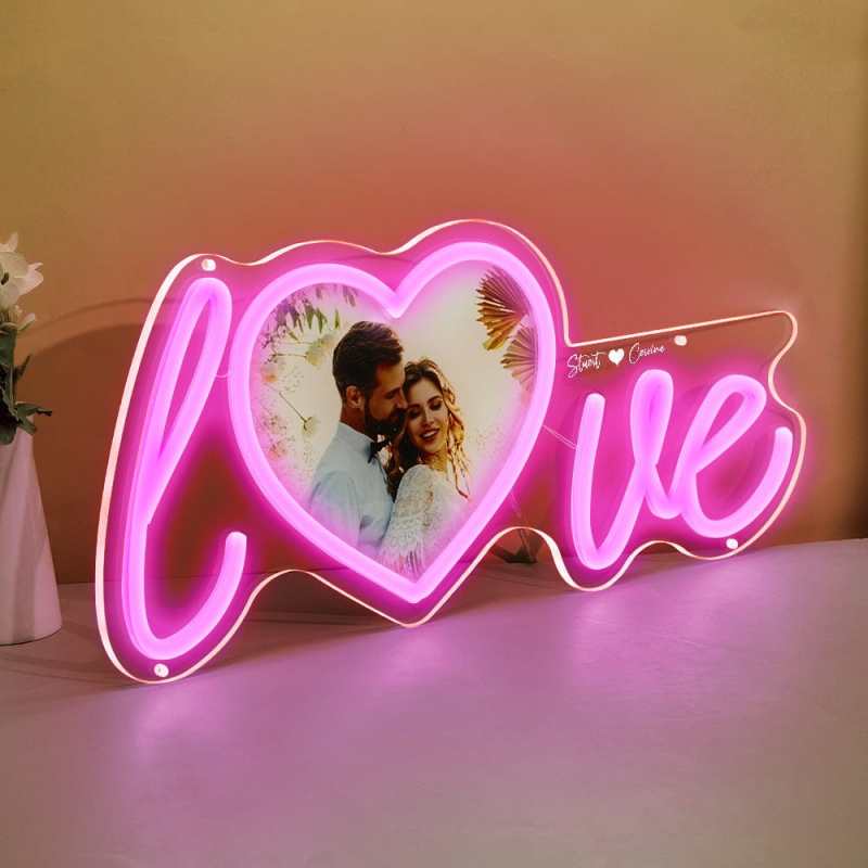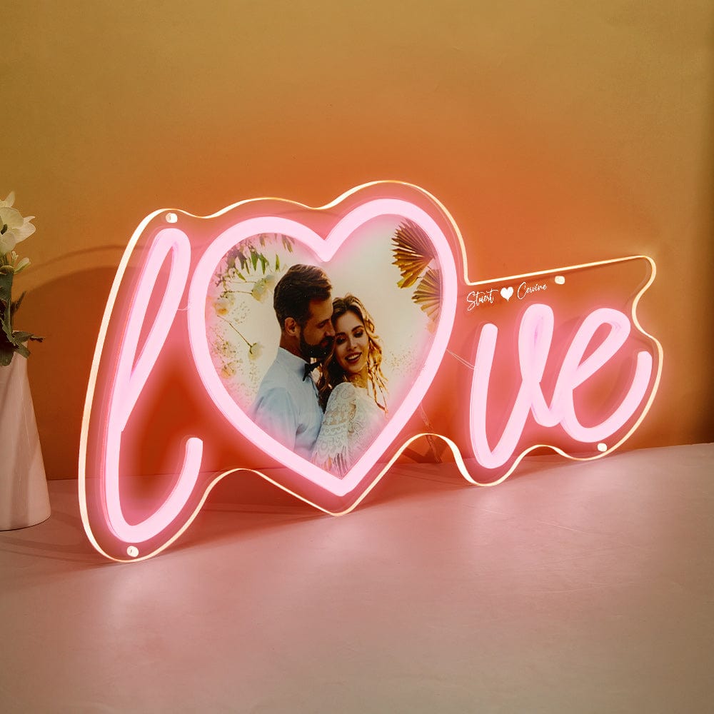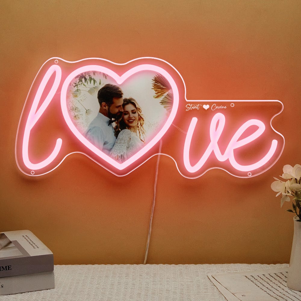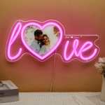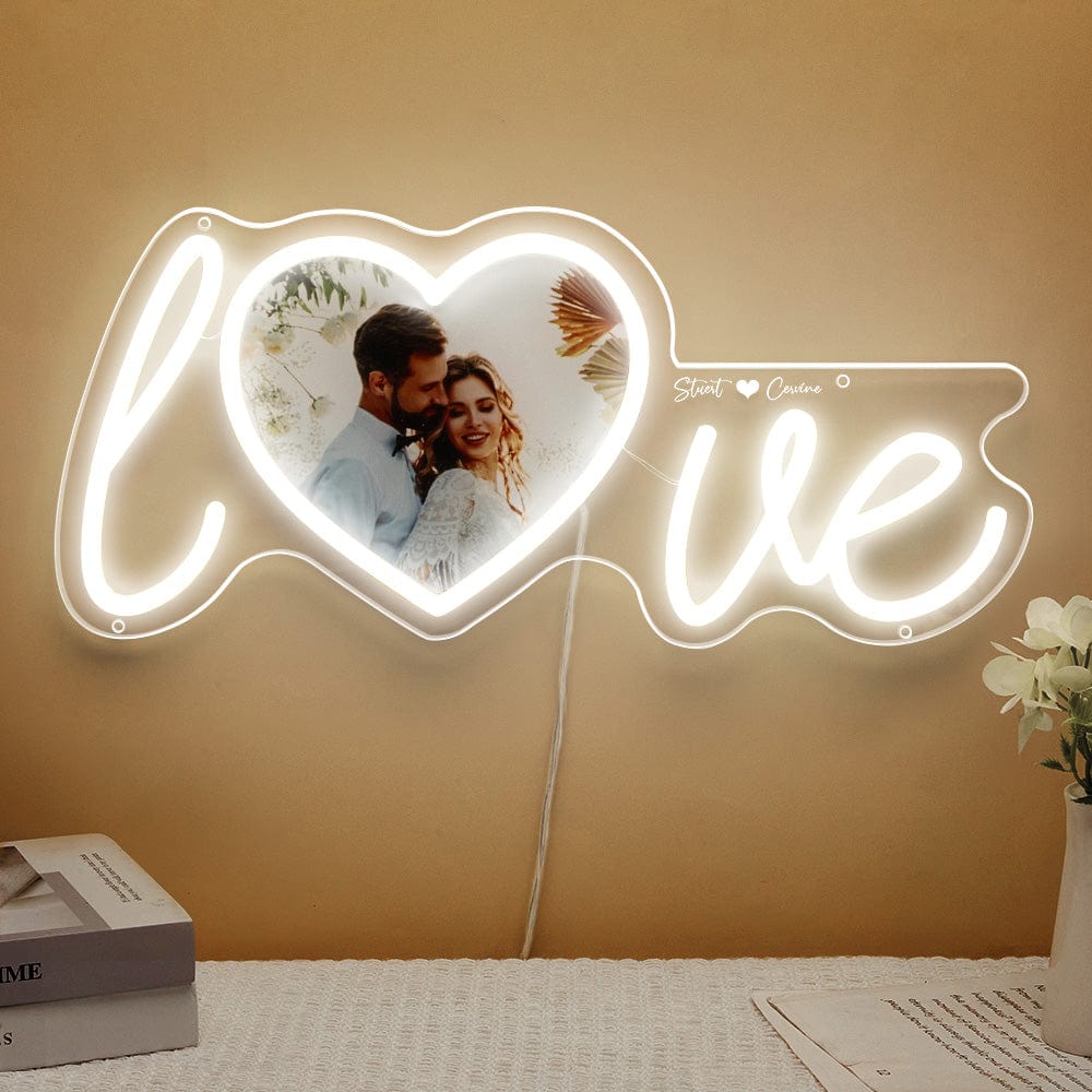 Customize your home with the Custom Photo and Name Love Heart Neon Lamp. Upload a couple photo and create a personalized name neon light for the perfect expression of your love. The love sign with heart shape photo adds a chic and unique touch to any room. Show your love and light up any space with this beautiful display.?Just plug in, a simple operation. The dimmer is on the usb cord, which is easy to adjust the brightness.