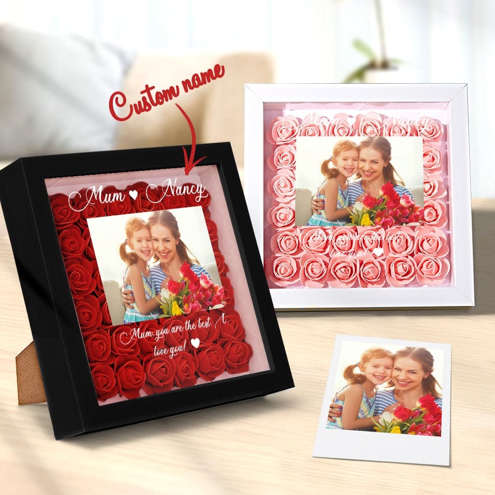 Surprise your loved one with this beautiful, personalized flower shadow box. You can customize it with the picture of you and mom, names and custom text to keep your special memories. Show your love with our beautiful roses with varied styles and colors available.