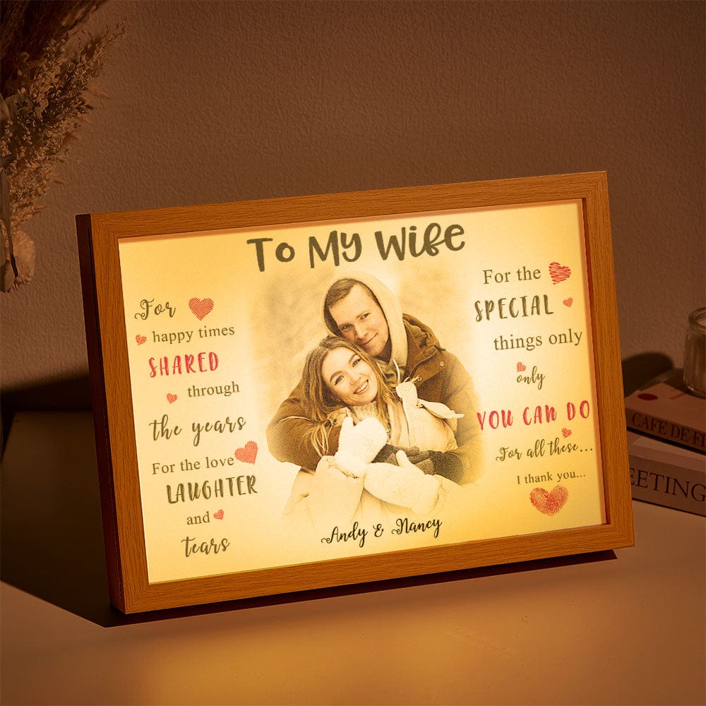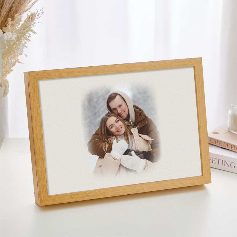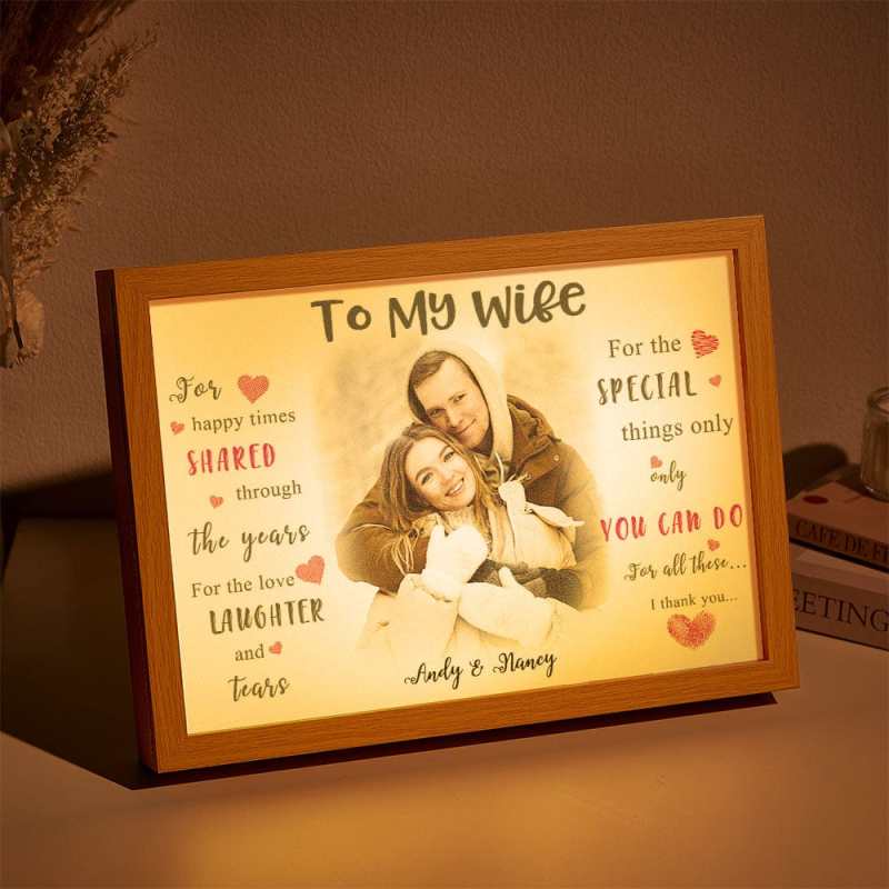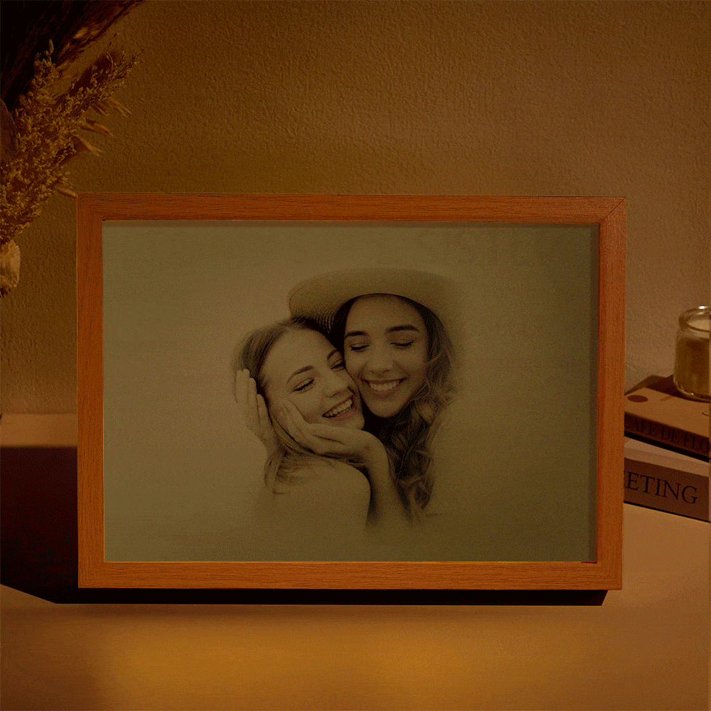 Bring a unique and personal touch to your home with this Custom Photo Lamp. The wooden frame holds a high-quality photo of your choosing, and when the light is switched on, the text?or your photo?is illuminated. When the light is off, the photo frame doubles as a decoration. With its customizable features, this lamp is an ideal way to add a personal touch to your home.