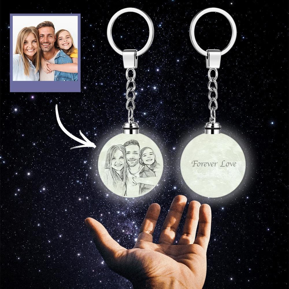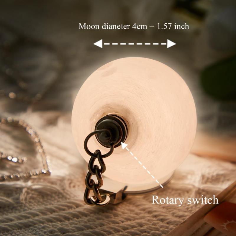 Multicolor light: White, Red, and Blue lighting color. Just turn the keychain knob clockwise to turn the moon lamp on and counter-clockwise to turn it off.