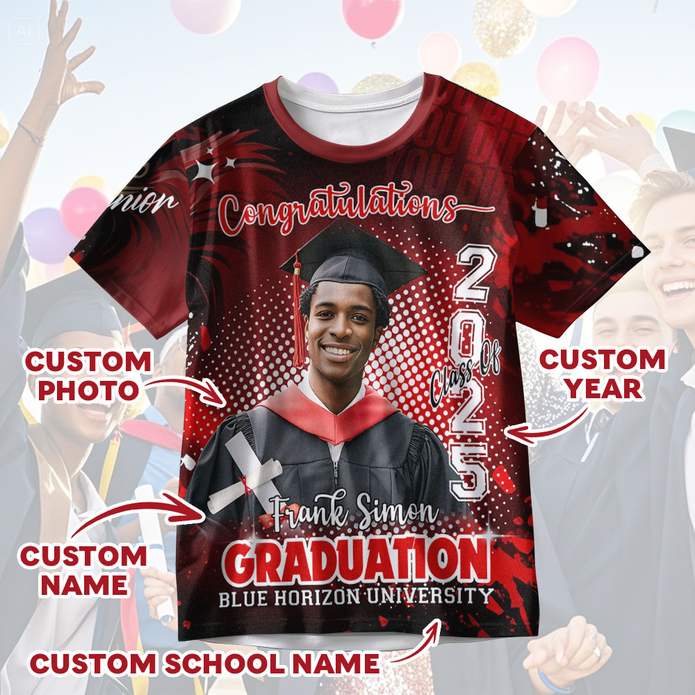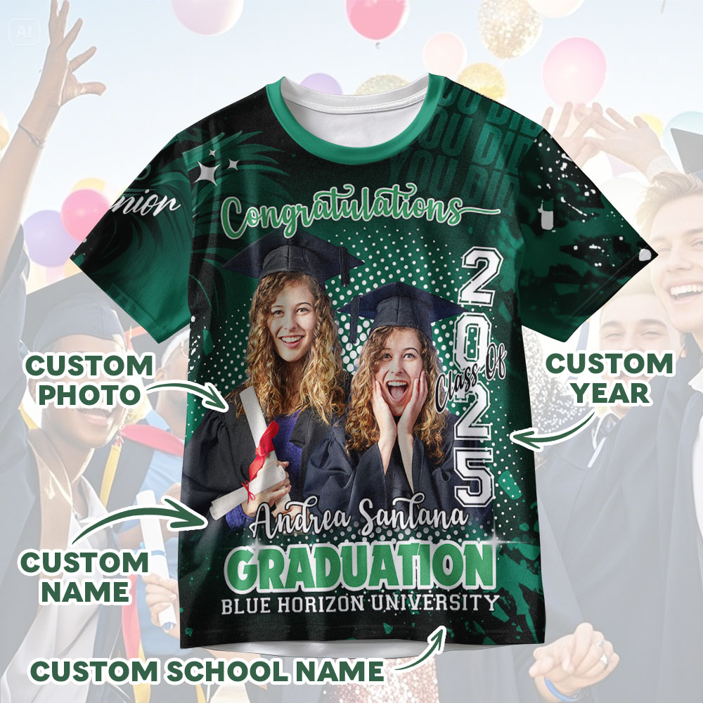 Celebrate their incredible achievement with a truly unique and memorable gift: our Custom 3D Graduation T-Shirt! This isn't just another ordinary graduation tee; it's a personalized keepsake that allows you to create a one-of-a-kind design to commemorate this special milestone.