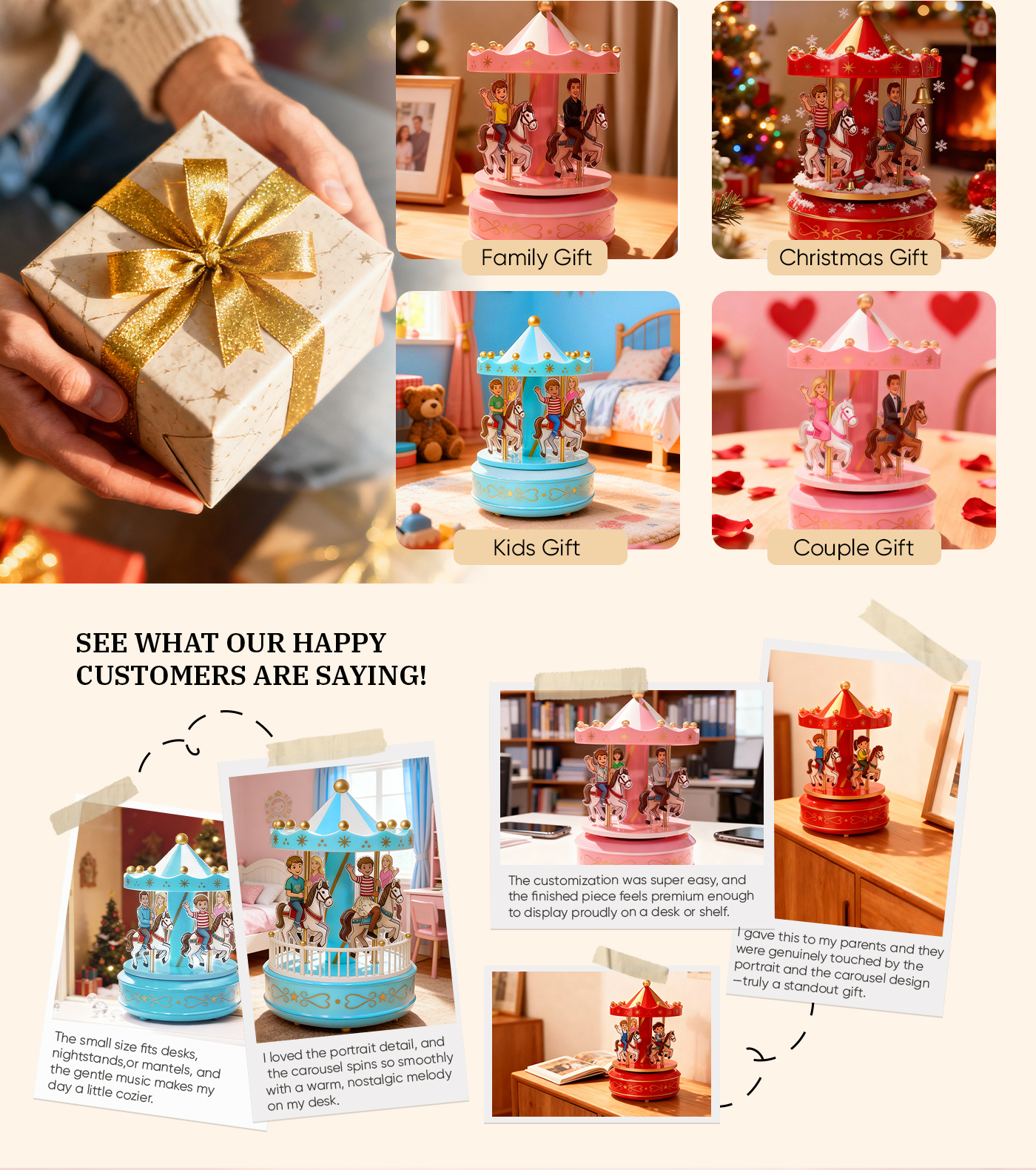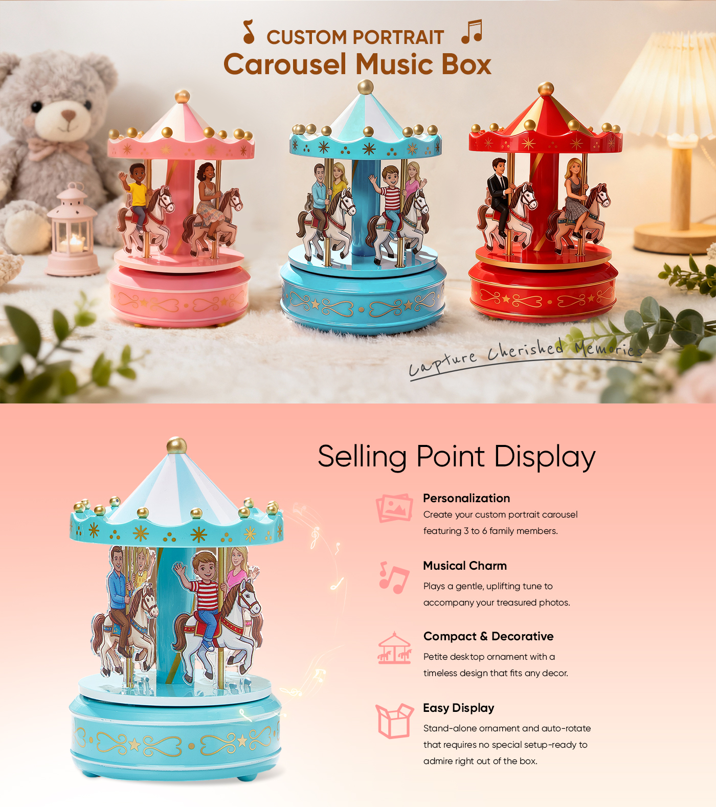 Capture cherished memories with our Custom Portrait Carousel Music Box Ornament. This elegant desktop decoration turns your family portraits into a delightful, spinning carousel that plays a soothing melody. Perfect for desks, shelves, or nightstands, it adds a personal touch to any space and serves as a heartwarming gift for loved ones.