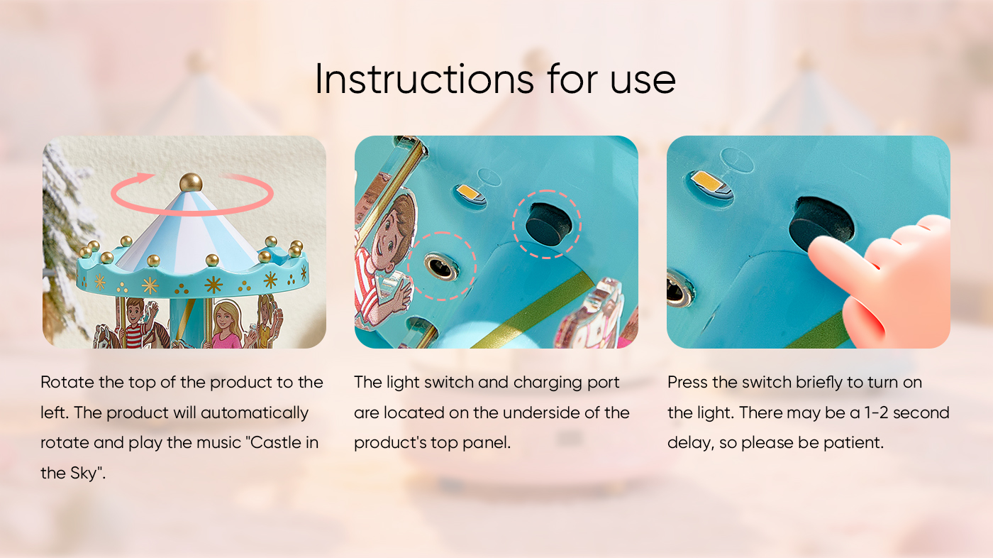 Rotate the top of the carousel to the left and the bottom to the right. The carousel will automatically rotate and play the music "Castle in the Sky".