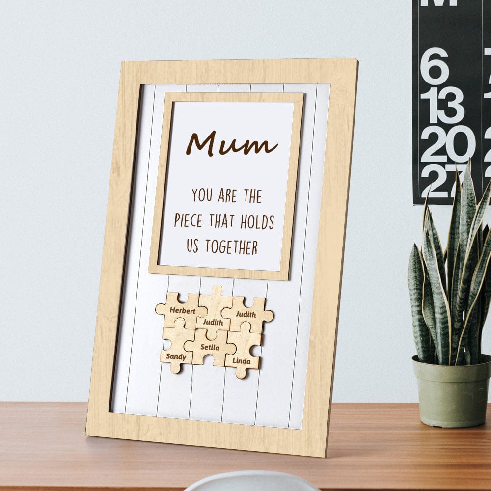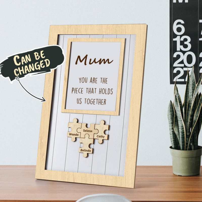 Personalized frames for home decor can be customized with your family's picture and family member's name up to 6 names. And proudly proclaim "You Are The Piece That Holds Us Together" to mum.