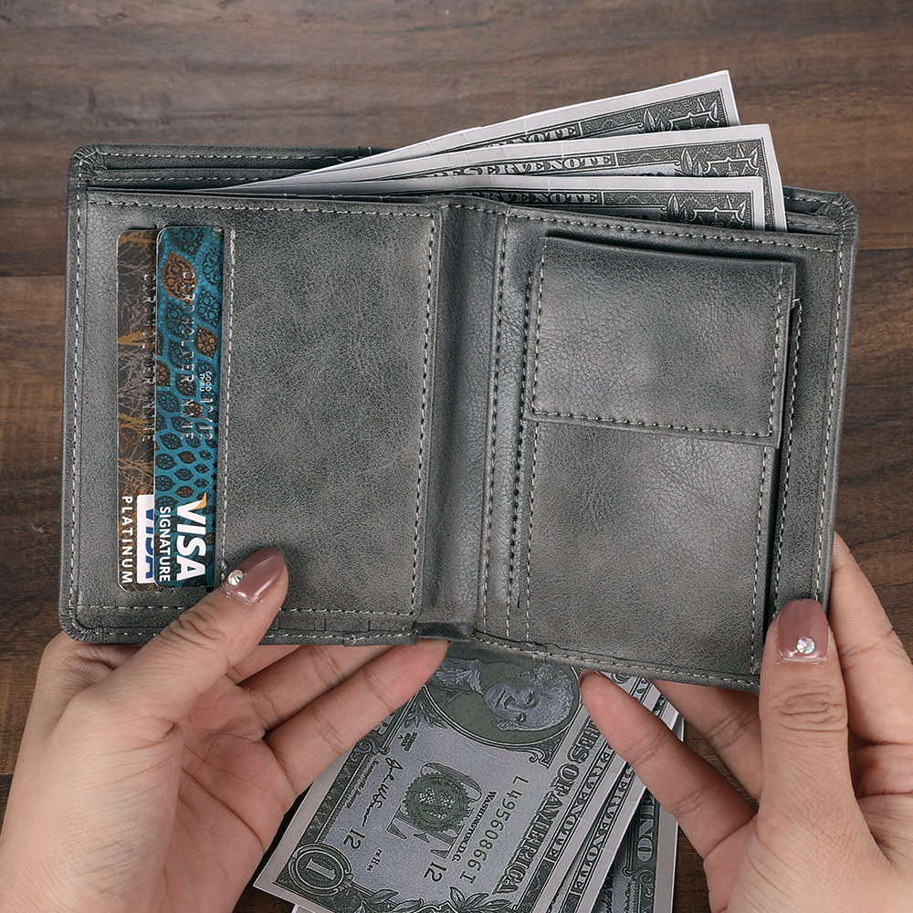 Custom Short Double-Sided Photo Engraved Wallet Grey Leather