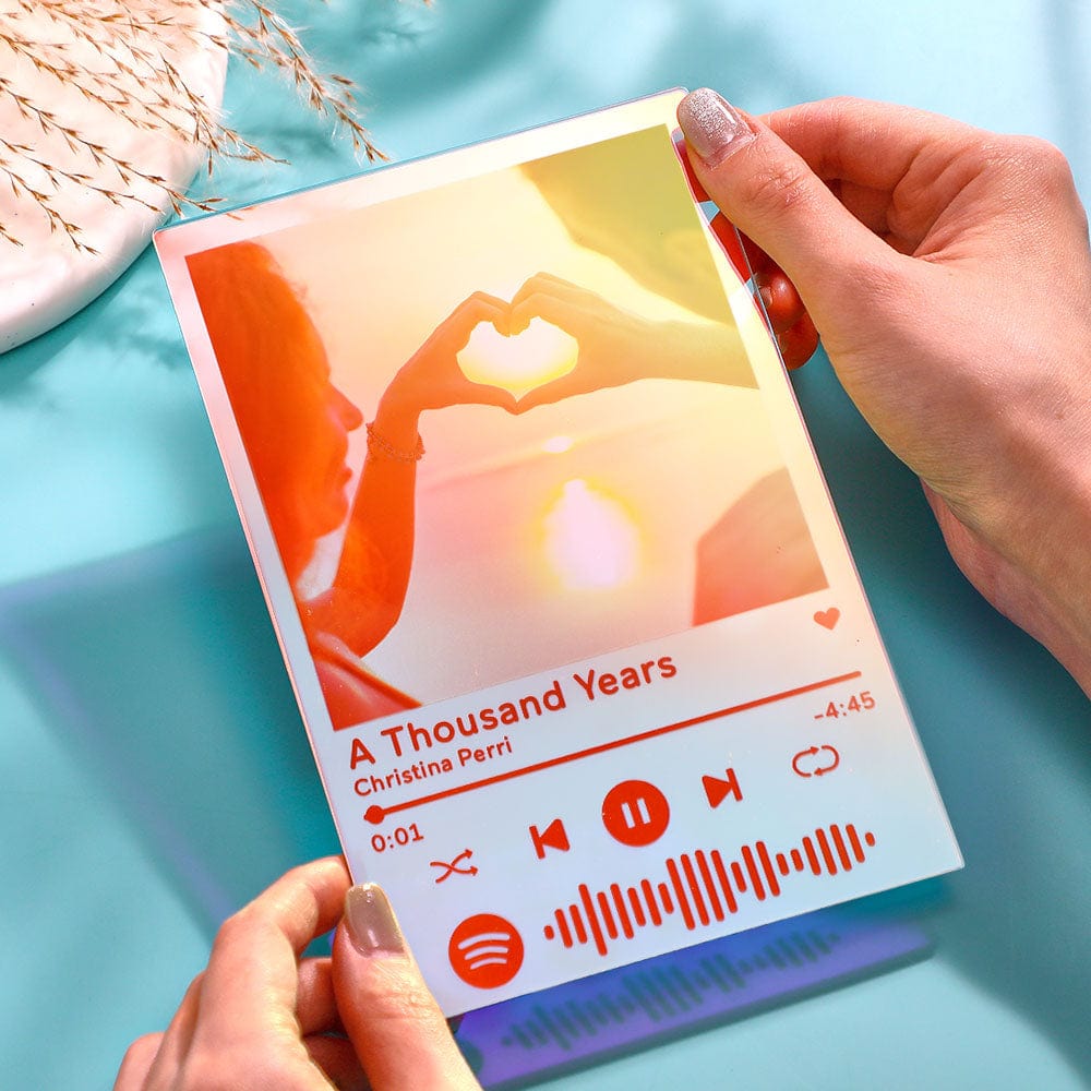 This unique acrylic plaque is a perfect gift for him/her on the anniversary. Customize the Spotify plaques. You can choose any song title, artist name, and favorite photos you want, all can be imprinted on the plaque, and then you can generate a unique Spotify code. Please note that the acrylic plaque itself does not emit music. You have to scan the code on the Spotify app, after scanning the code on Spotify, your song will start playing immediately. On any memorable day, this is the most romantic gift, play the most beautiful music for your love.