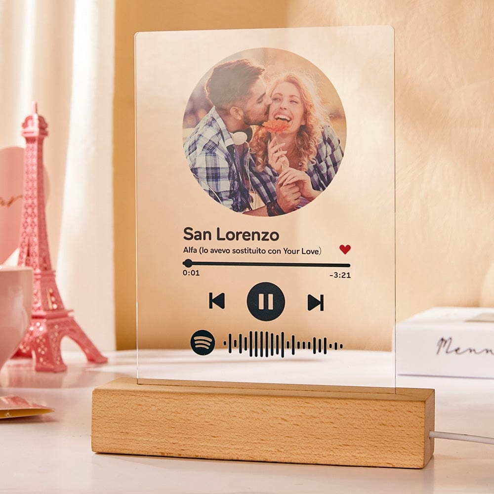 You can choose any song title, artist name, and favorite photos you want, all can be imprinted on the acrylic plaque, and you can generate a unique Spotify code.