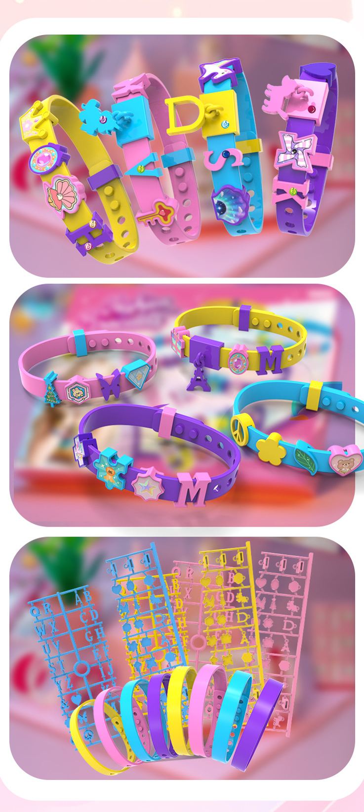 Rich Accessories: bracelets in random colors with clasps. Features multi-colored letter, flower, heart patterns and sparkling stickers. Diverse styles and colors cater to all preferences. Kids can use their creativity and mix and match freely