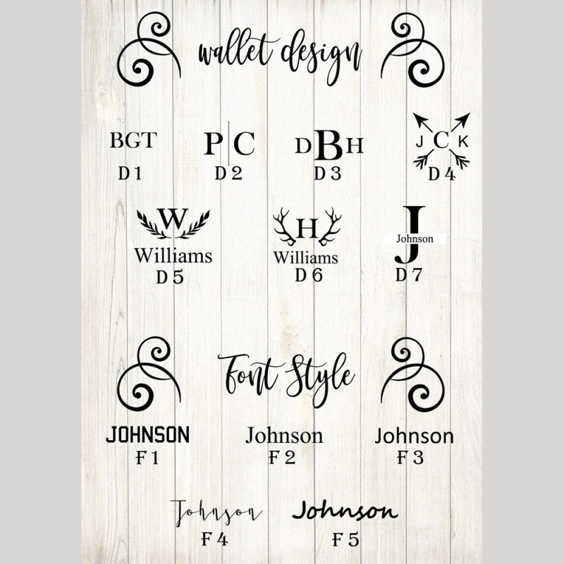 3. front and inside: See the last picture of the listing for optional designs and fonts, and let me know what would you like to engrave on the outside front and inside of the wallet. (Please read the instruction of how to engrave on outside front only and inside right only).