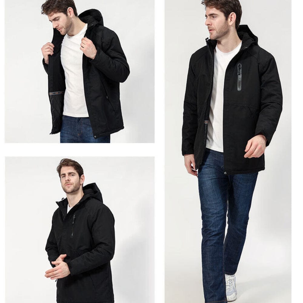Our heated jacket is equipped with 3 carbon fiber heating zones (two on the front, one on the back). It can heat your entire core body area and keeps you warm, there are two heating zones near the front pockets that can keep your hands warm at the same time. You can adjust 3 heating modes by short pressing the power button. Keep you warm in extremely cold winter.