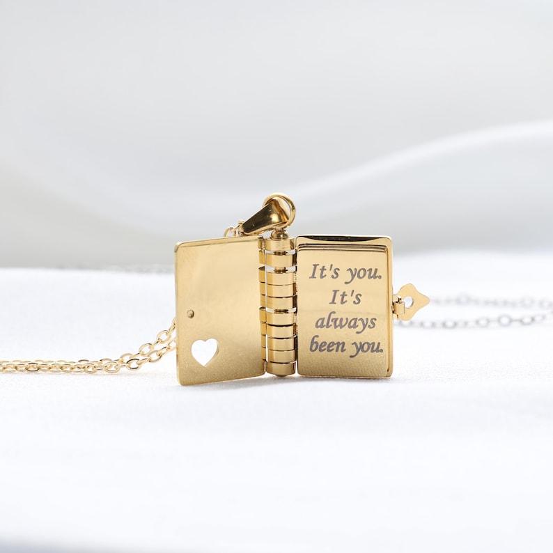 This heartwarming necklace is a love letter she can wear close to her heart. With 7 engraved pages of sweet, emotional words, this mini book pendant opens like a real locket—each page telling a chapter of your love story.