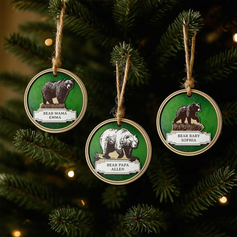 Crafted from durable wood with a smooth finish, it features a beautiful bear family motif and your custom name, engraved with care. Measuring approximately 9?cm in diameter, it’s compact yet meaningful.