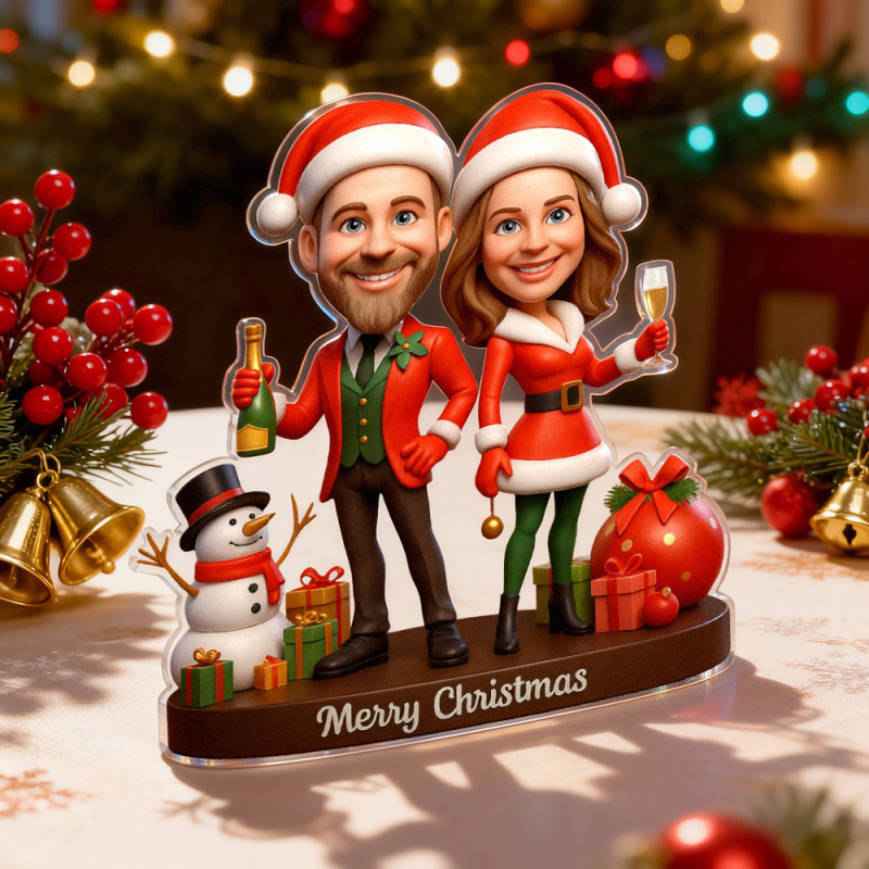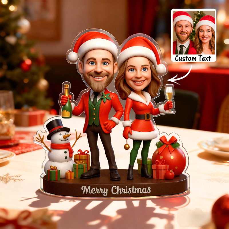 Personalized Christmas Couple Portrait Gift - Custom Face Illustration with Engraved Base