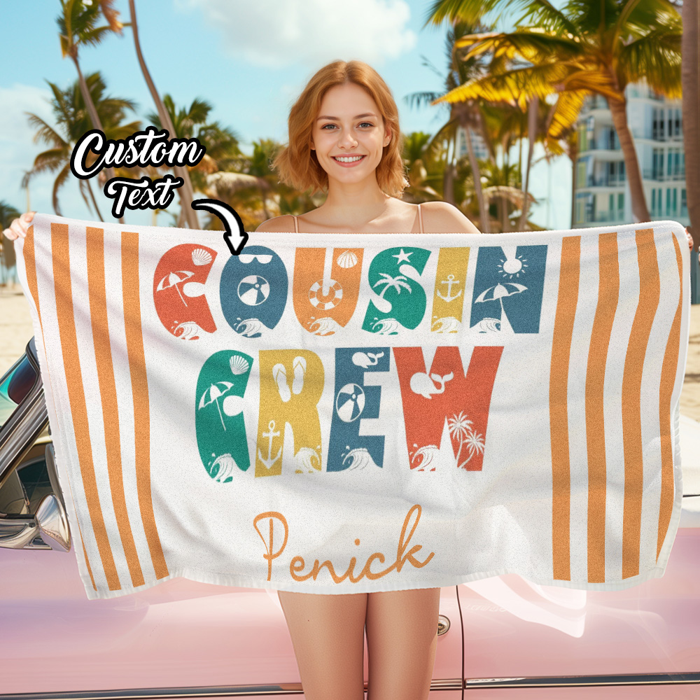 Personalized Name Cousin Crew Beach Towel - This customizable cousin crew beach towel is made of high-quality materials, soft and absorbent, comfortable and durable, ideal for the beach, pool or outdoor activities.