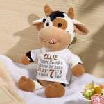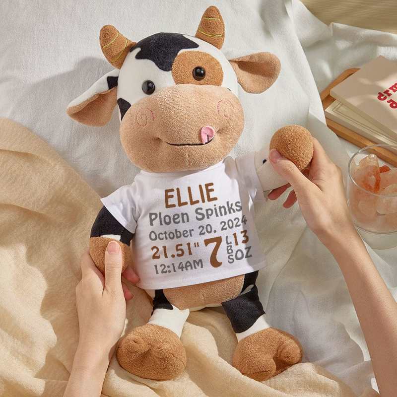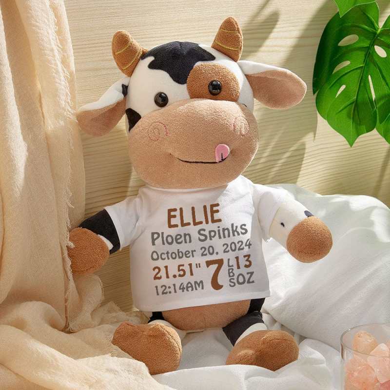 Introducing the perfect gift for any baby shower - the Personalized Cow Plush Stuffed Toy Birth Announcement! Made with soft and durable materials, this adorable cow plush toy can be personalized with the baby's name and birthdate. Give a gift that will be cherished for years to come.
