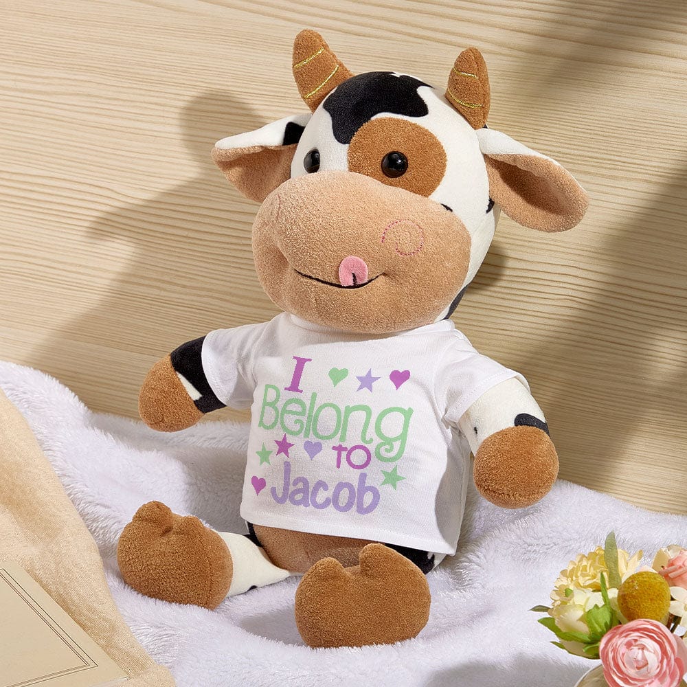 This personalized cow plush stuffed toy makes the perfect gift for a baby shower! Handcrafted with high-quality materials, each toy is customized with the baby's name for a unique touch. Soft and cuddly, it is sure to become an instant favorite for both the baby and parents. Give the gift of comfort and personalization with this adorable stuffed toy.