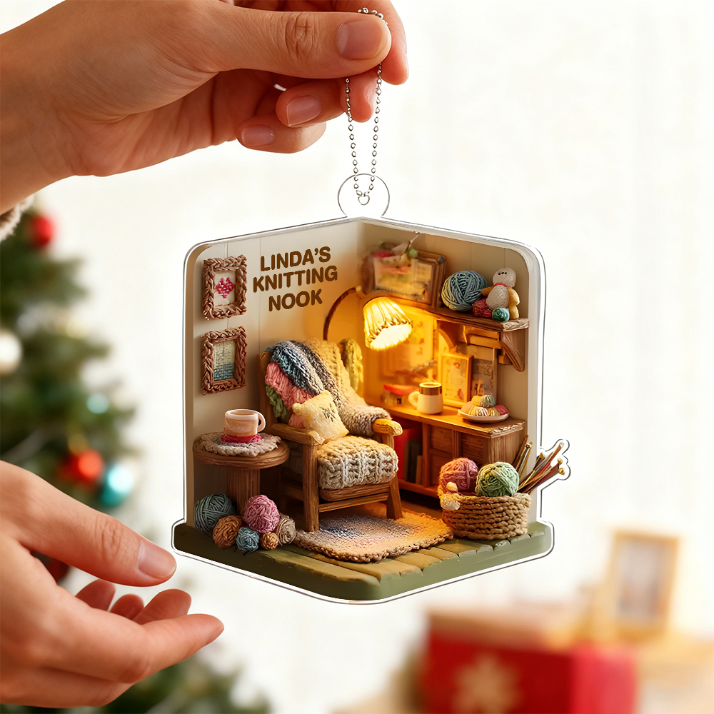 Create a warm holiday atmosphere with this Personalized Knitting Nook Ornament, designed like a cozy little corner for every knitting lover. Featuring a soft armchair, colorful yarn balls, knitting needles, and a glowing lamp, it captures the comfort and joy of handmade crafts.