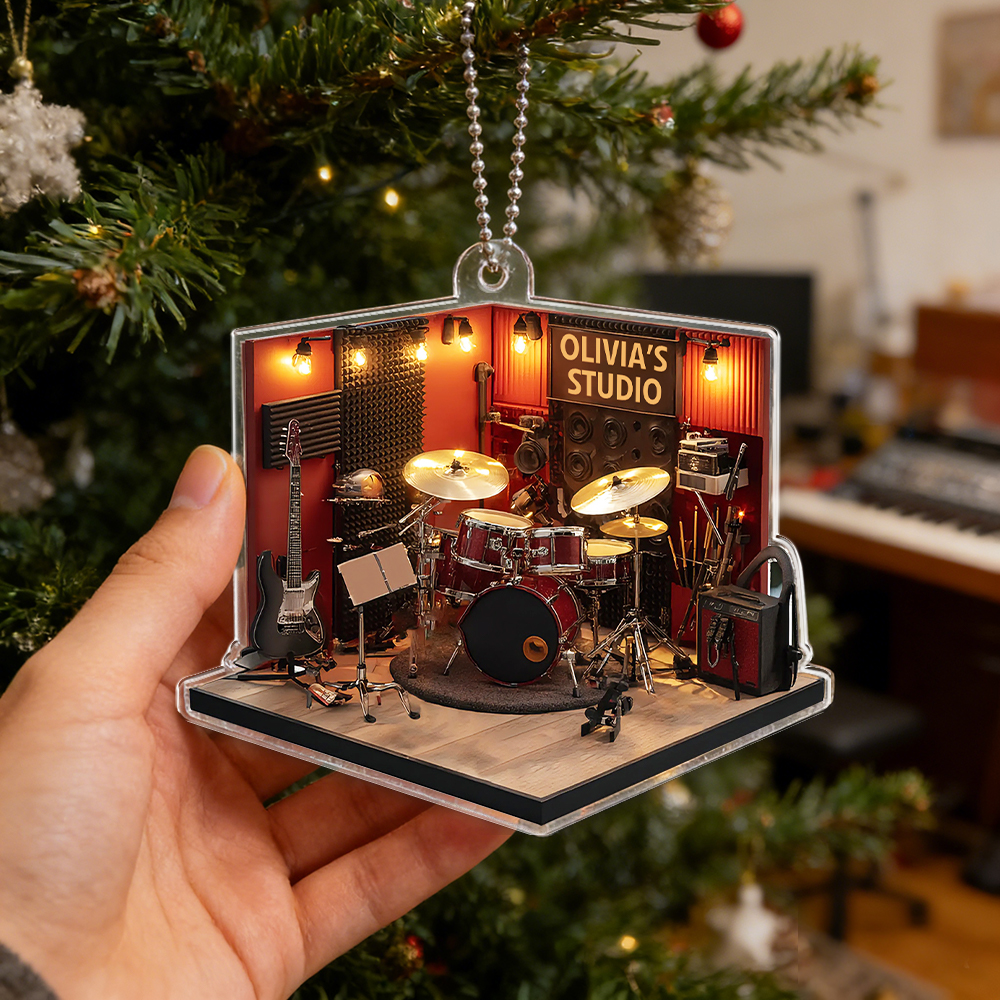 Turn your love of music into a holiday centerpiece with our Personalized Drum Studio 2D Flat Acrylic Ornament. At first glance, it looks like a miniature 3D drum studio complete with a full drum set, guitars, amplifiers, music stands, and glowing lights. But here’s the secret – it’s actually a 2D flat ornament, specially designed with high-quality printing to create the illusion of depth and dimension.