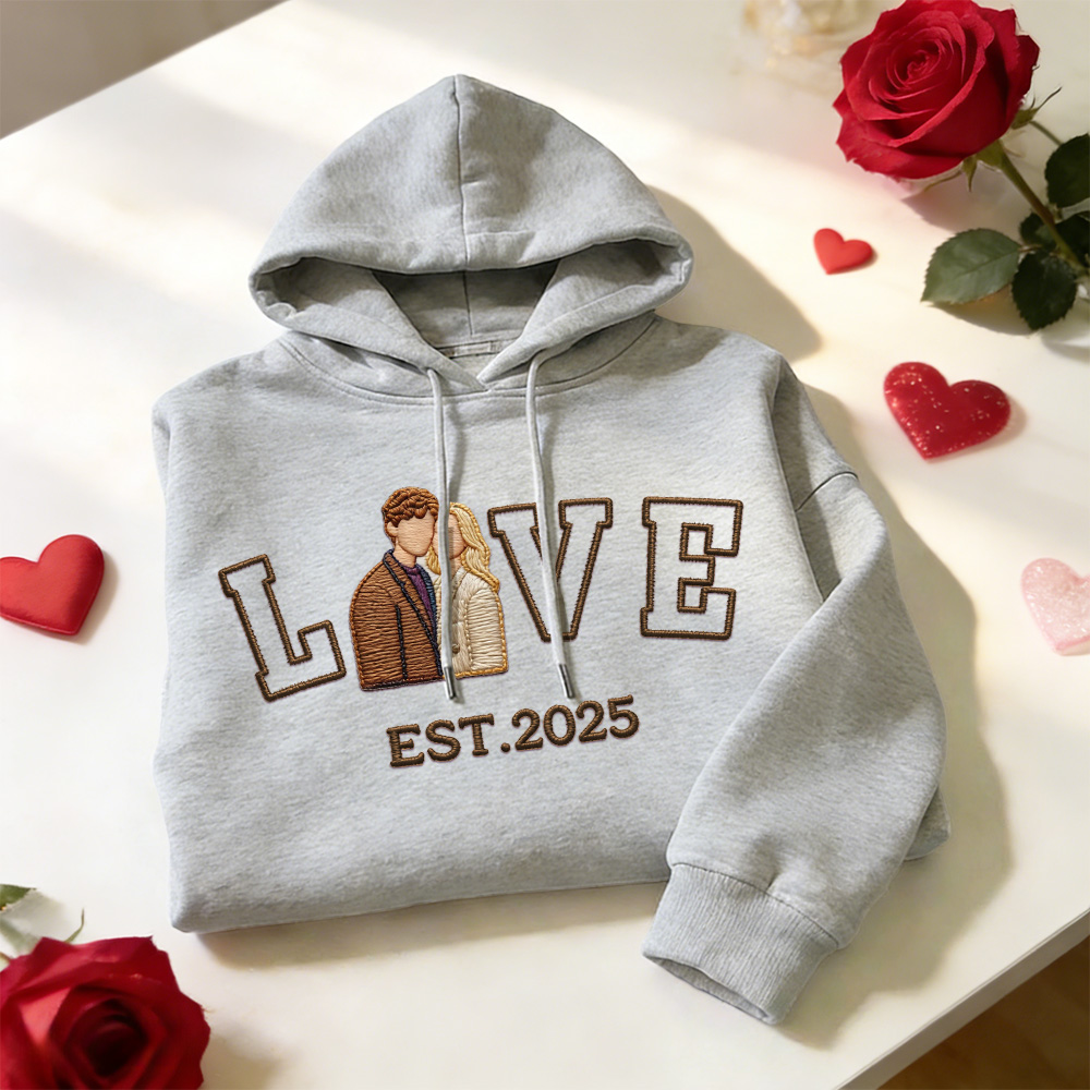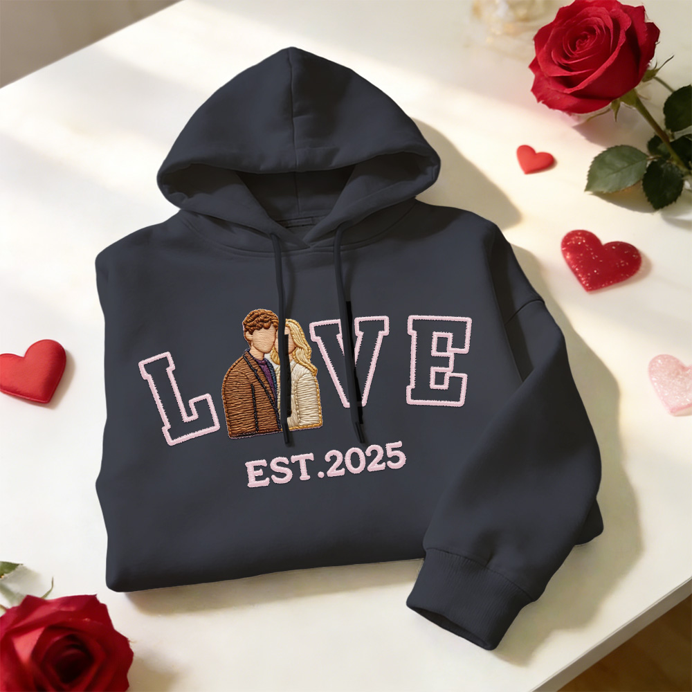 Celebrate your love with a personalized embroidered couple sweatshirt or hoodie, crafted to turn your favorite photo into a timeless stitched design. Featuring a custom couple portrait, romantic LOVE text, and your special EST year, this piece is made to commemorate meaningful moments in a subtle yet lasting way.