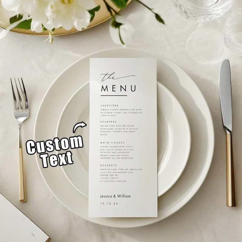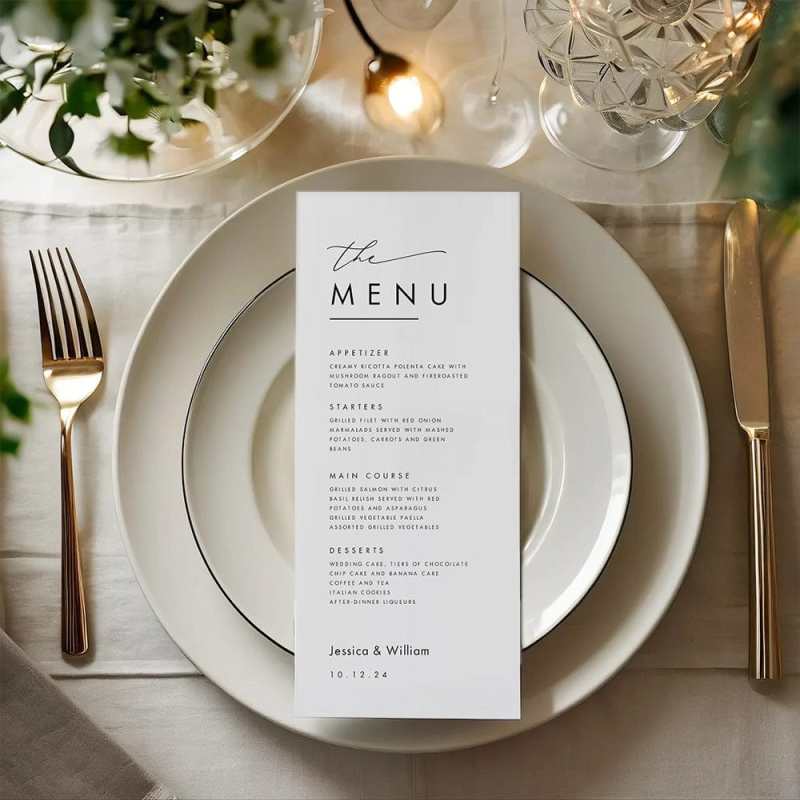 Enhance your wedding reception with our Personalized Minimalist Wedding Dinner Menu. Make your guests feel special with a customized menu featuring a simple and elegant design. Add a personal touch to your special day with our high-quality menu cards.