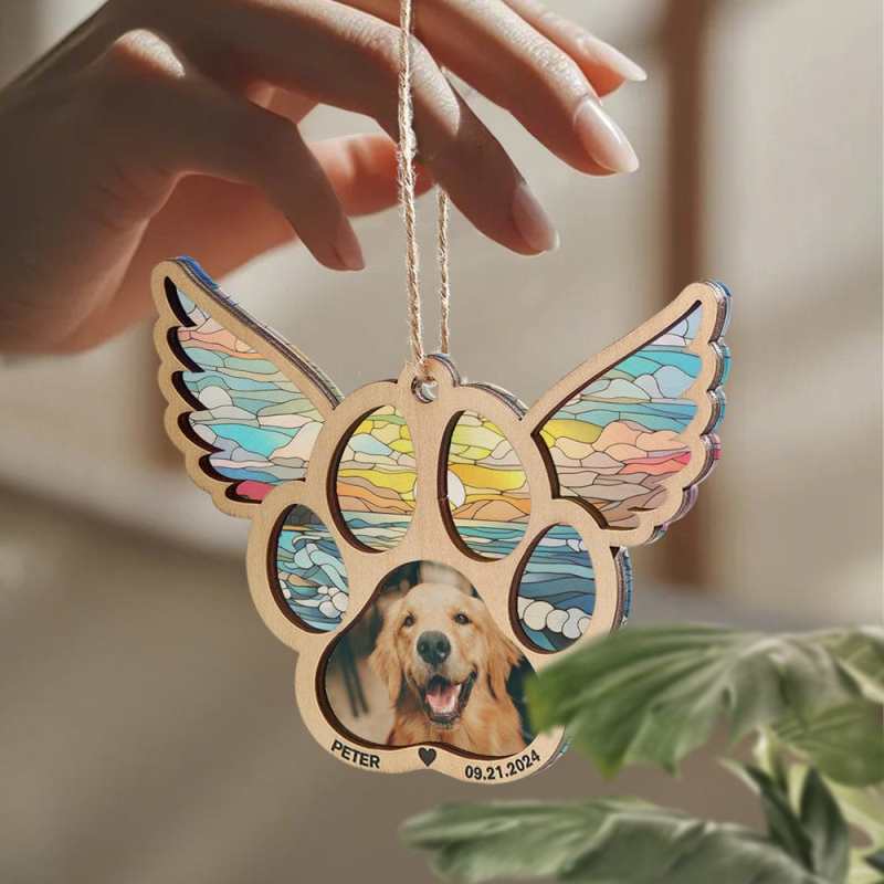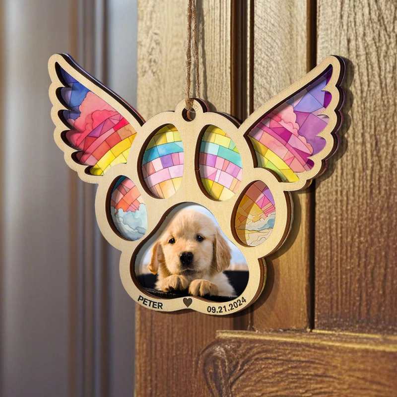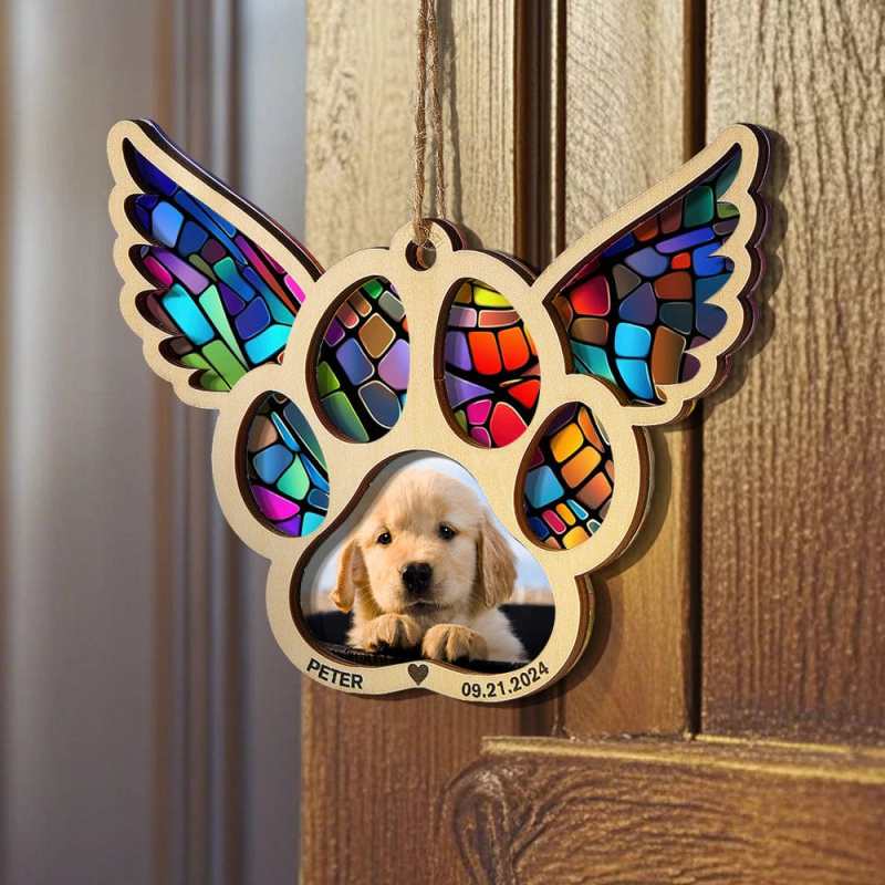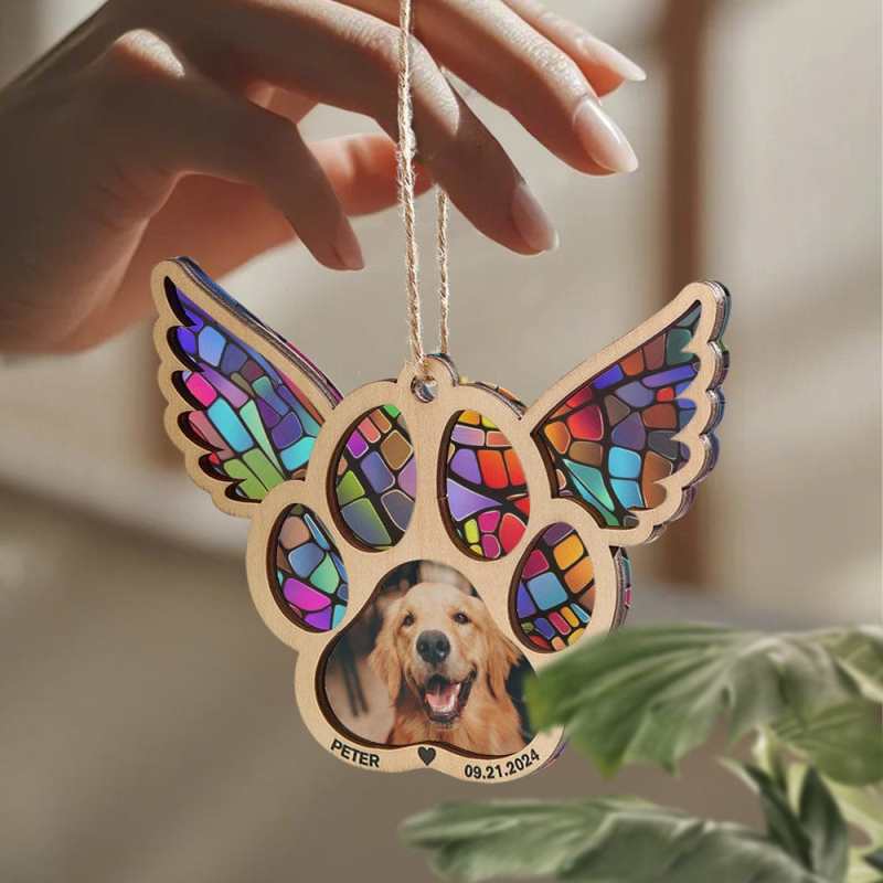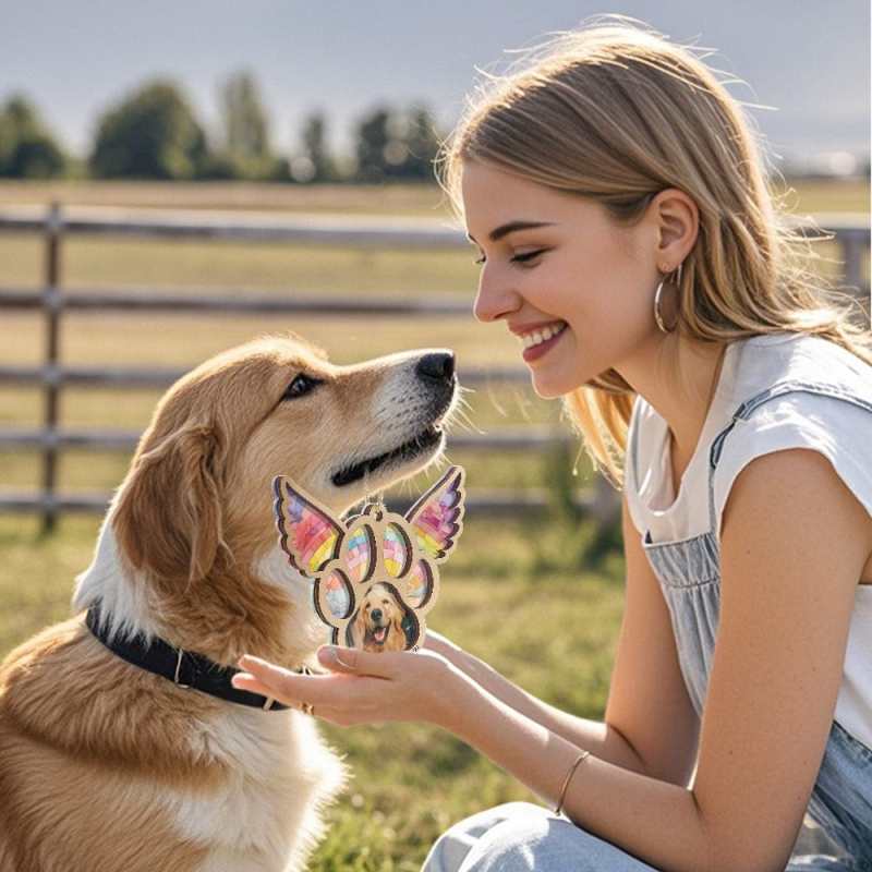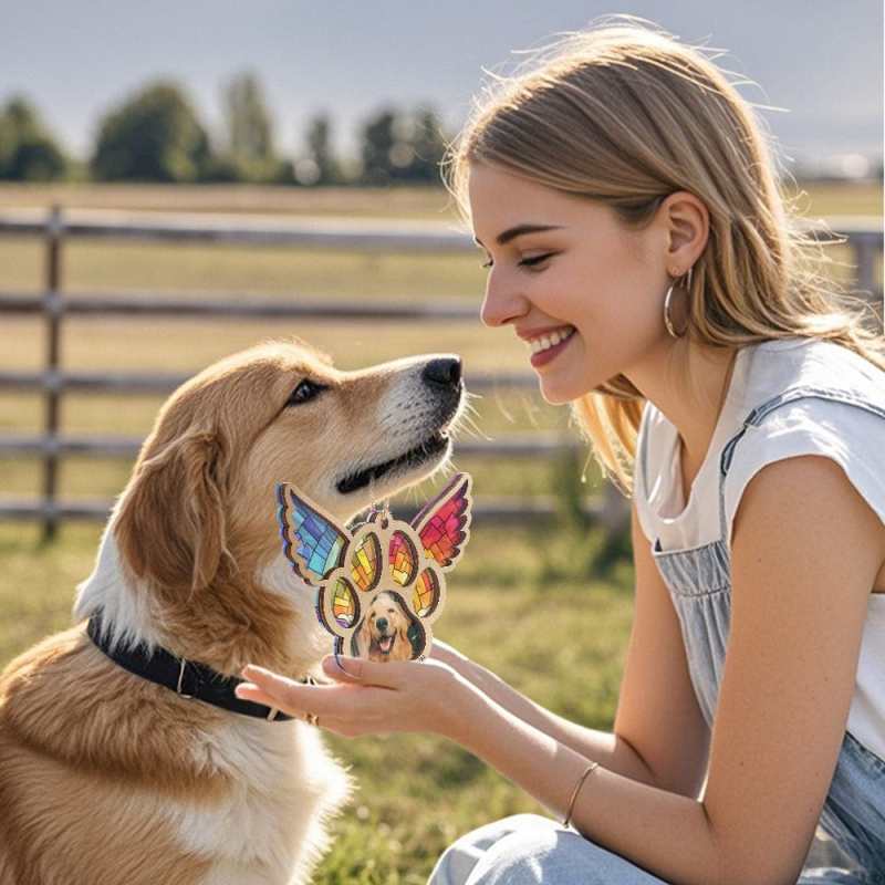 Celebrate the memory of your furry friend with our personalized pet suncatcher ornament. This special ornament features your pet's name and photo, making it a beautiful memorial gift for pet lovers. Each one is custom-made and captures the unique bond between you and your beloved pet.