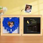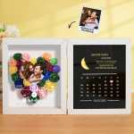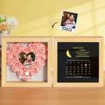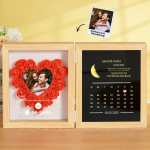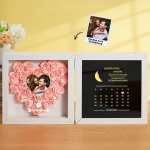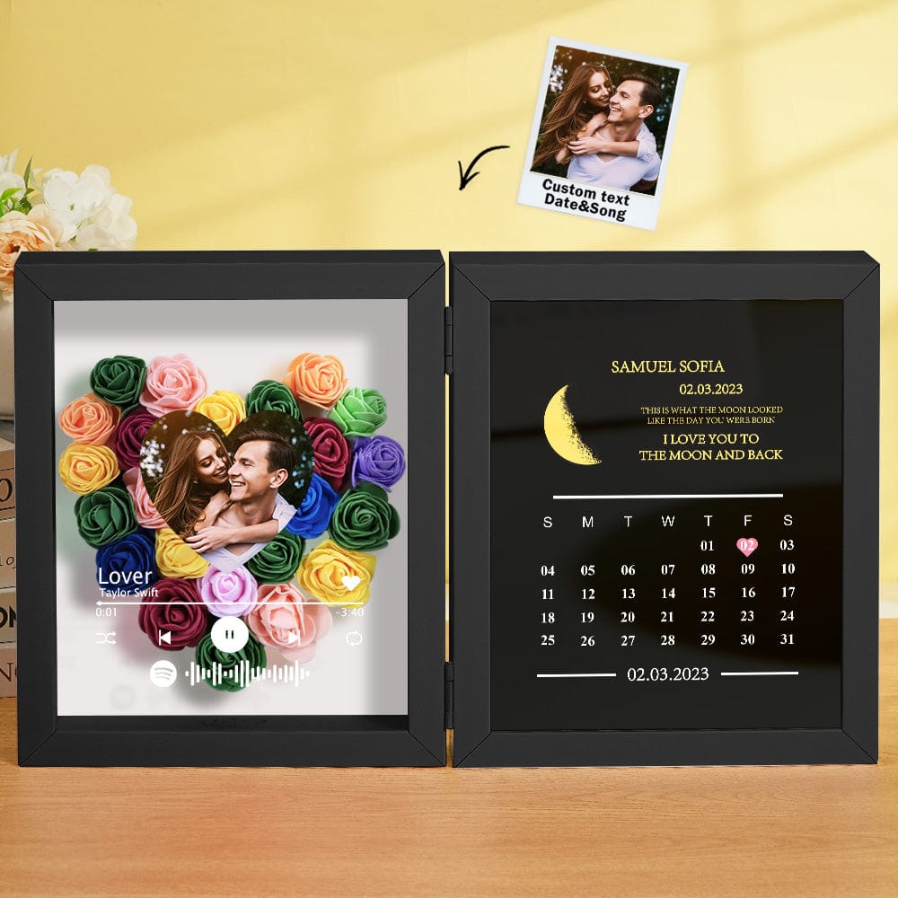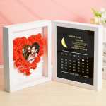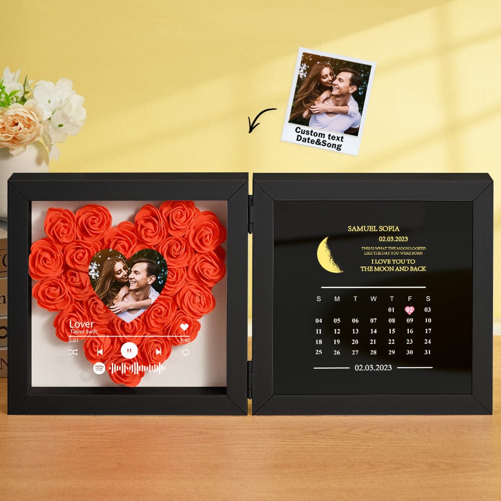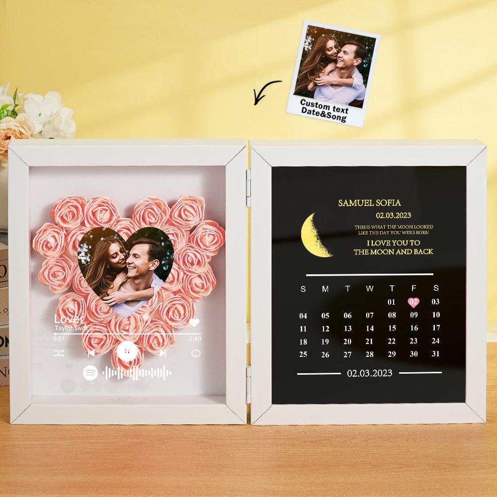 This personalized flower box frame is a memorable gift for her, featuring a custom Spotify code and photo. Choose the date for a printed moon phase and calendar, adorned with your own words and name. Select from a variety of rose colors for a truly unique and special present.