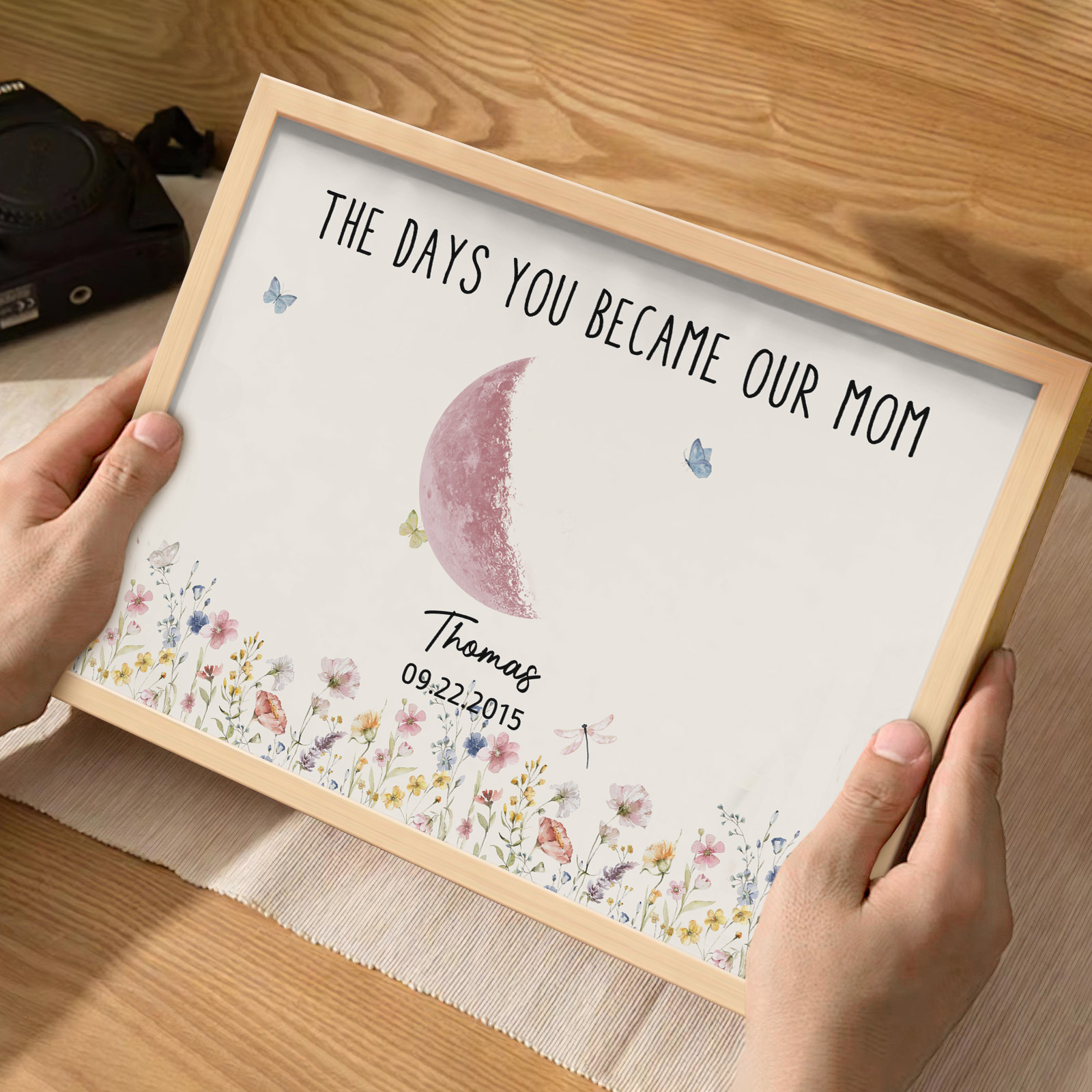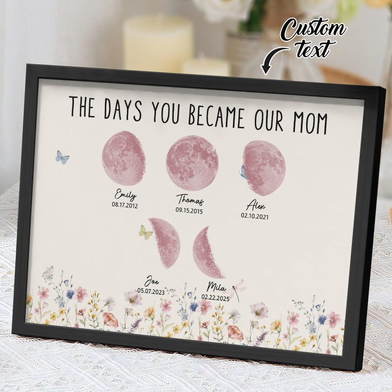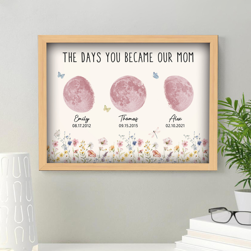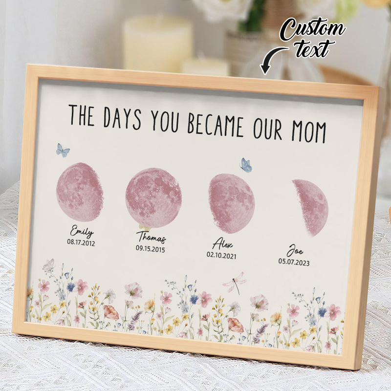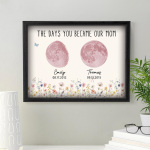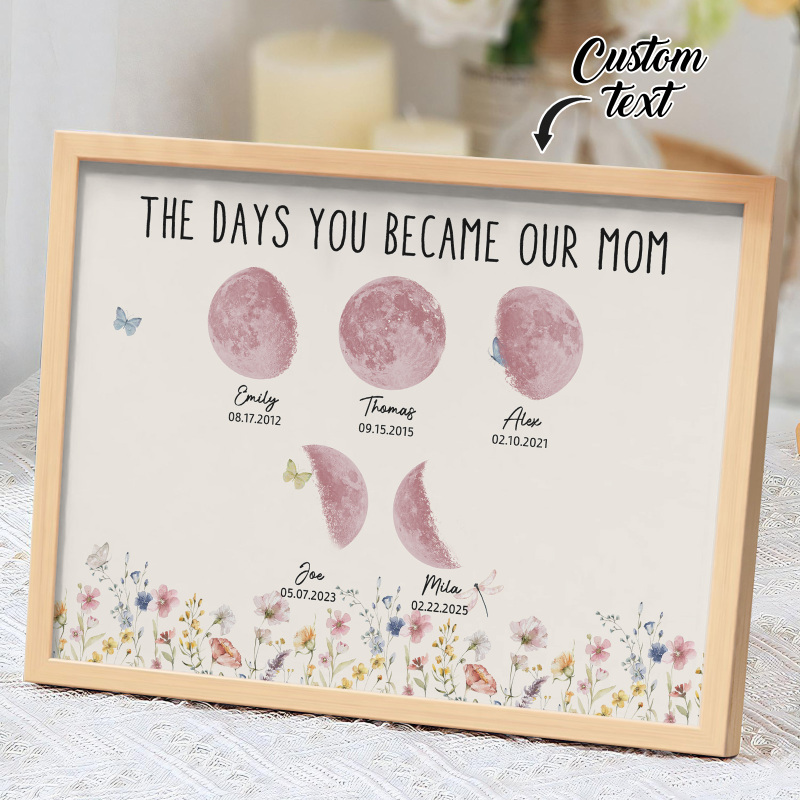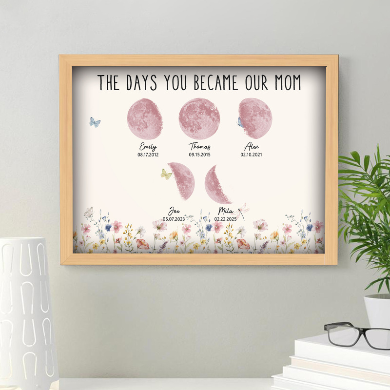 Each child’s name, birthdate, and unique moon phase are beautifully displayed, creating a one-of-a-kind celestial keepsake that honors the special moments that made her a mother.