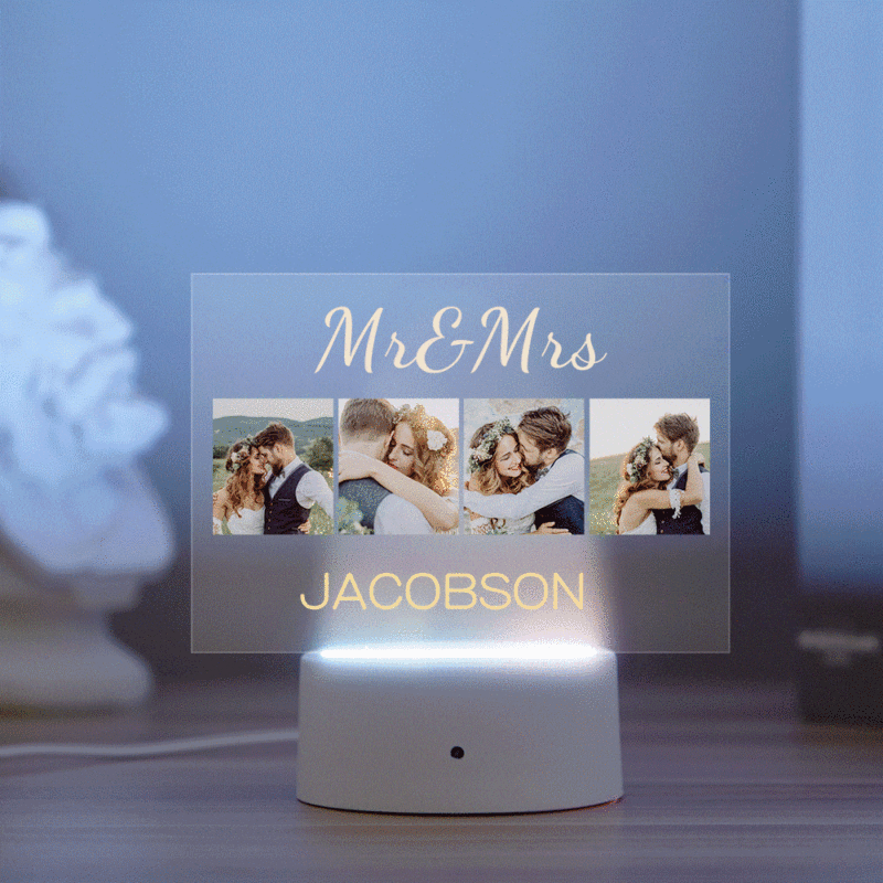 Custom your own unique personalized gift. You can upload the photos you want. Record the happy memories of the wedding day. It is the perfect gift for a married couple. The acrylic slide fits in the base which provides light to illuminate the entire slide from bottom to top. Powered by USB cord or 3 AA batteries ( not included ). Makes no heat and is safe for the room.