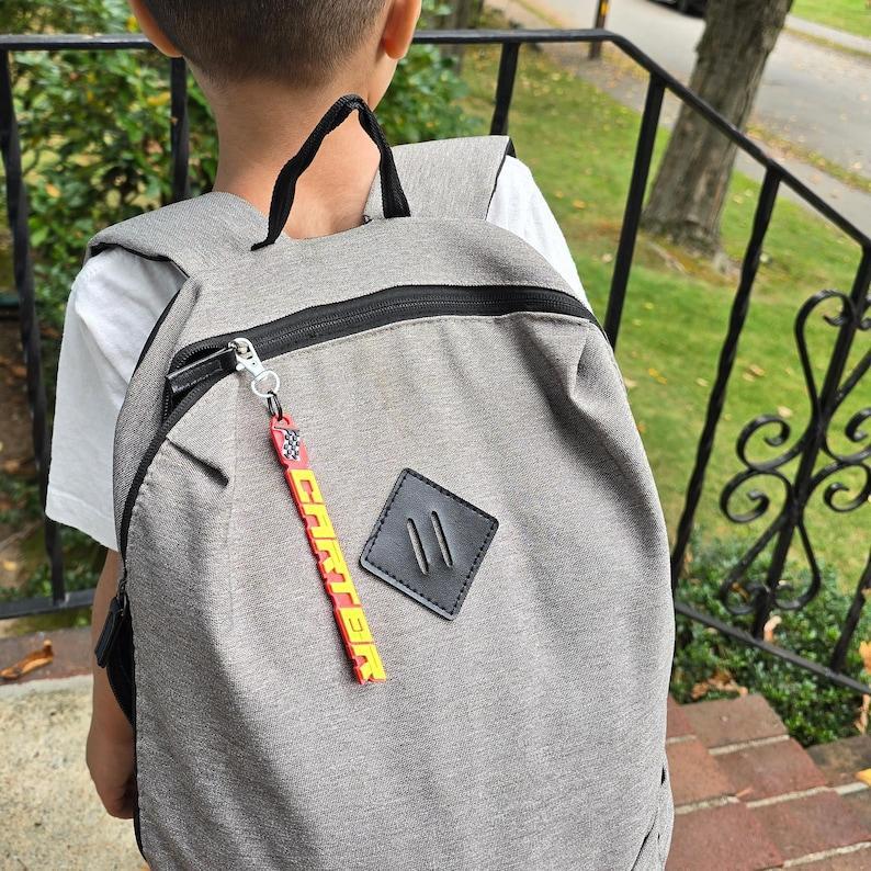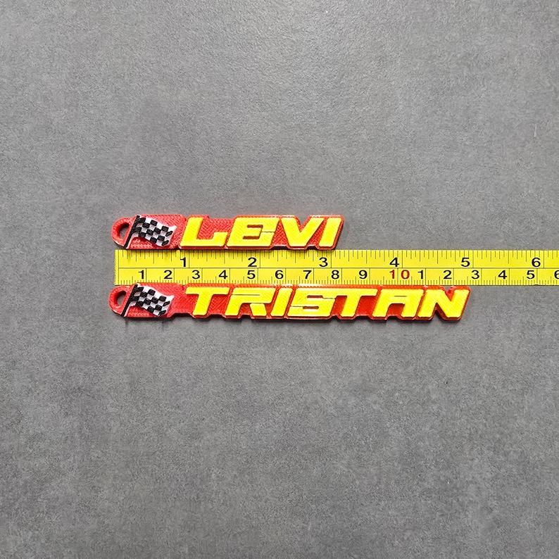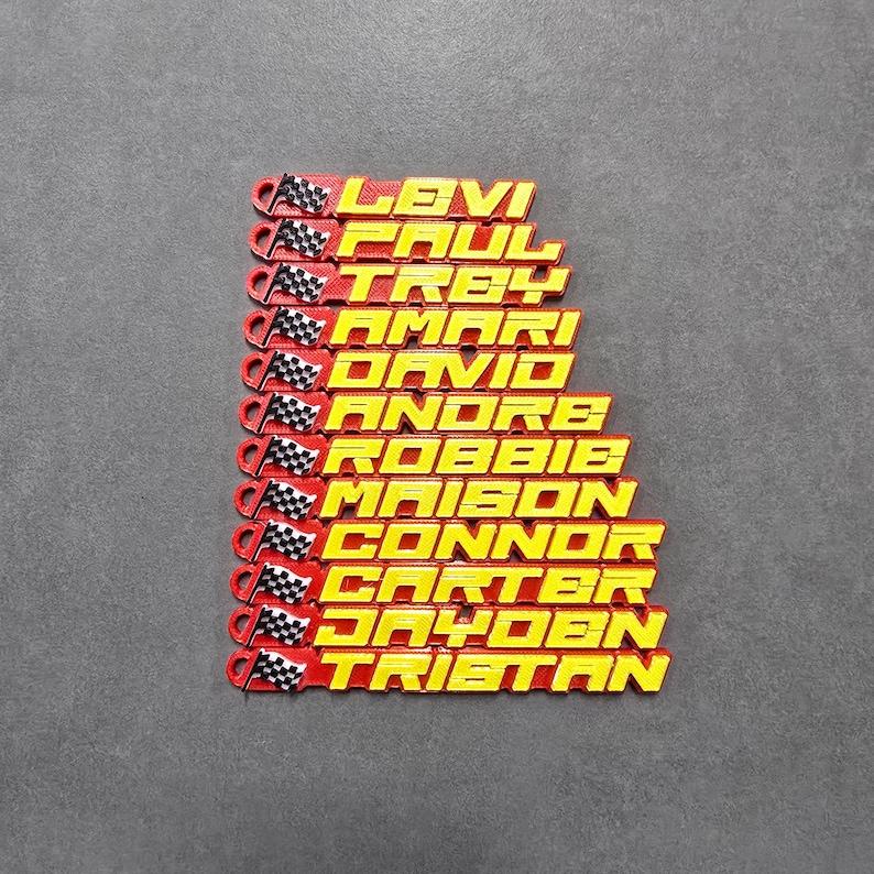 Our racing inspired 3D printed name tags are here! These cool keychains have a bright red backplate with shiny yellow lettering and a racing flag. They have several uses such as personalizing backpacks / schoolbags, luggage, gym bags, keychains and more! Check out our store for many more 3D printed name tags in all different fonts, sizes and colors!
