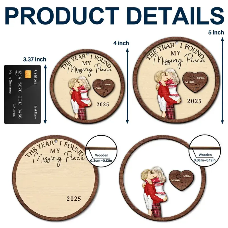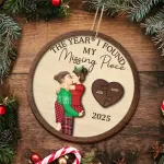 Capture the essence of love with The Year I Found My Missing Piece Kissing Couples - Personalized 2-Layered Wooden Ornament. This unique ornament makes a heartfelt gift for couples, husbands, wives, moms, dads, boyfriends, and girlfriends on Valentine's Day, Mother's Day, Father's Day, Thanksgiving, Christmas, birthdays, and anniversaries.